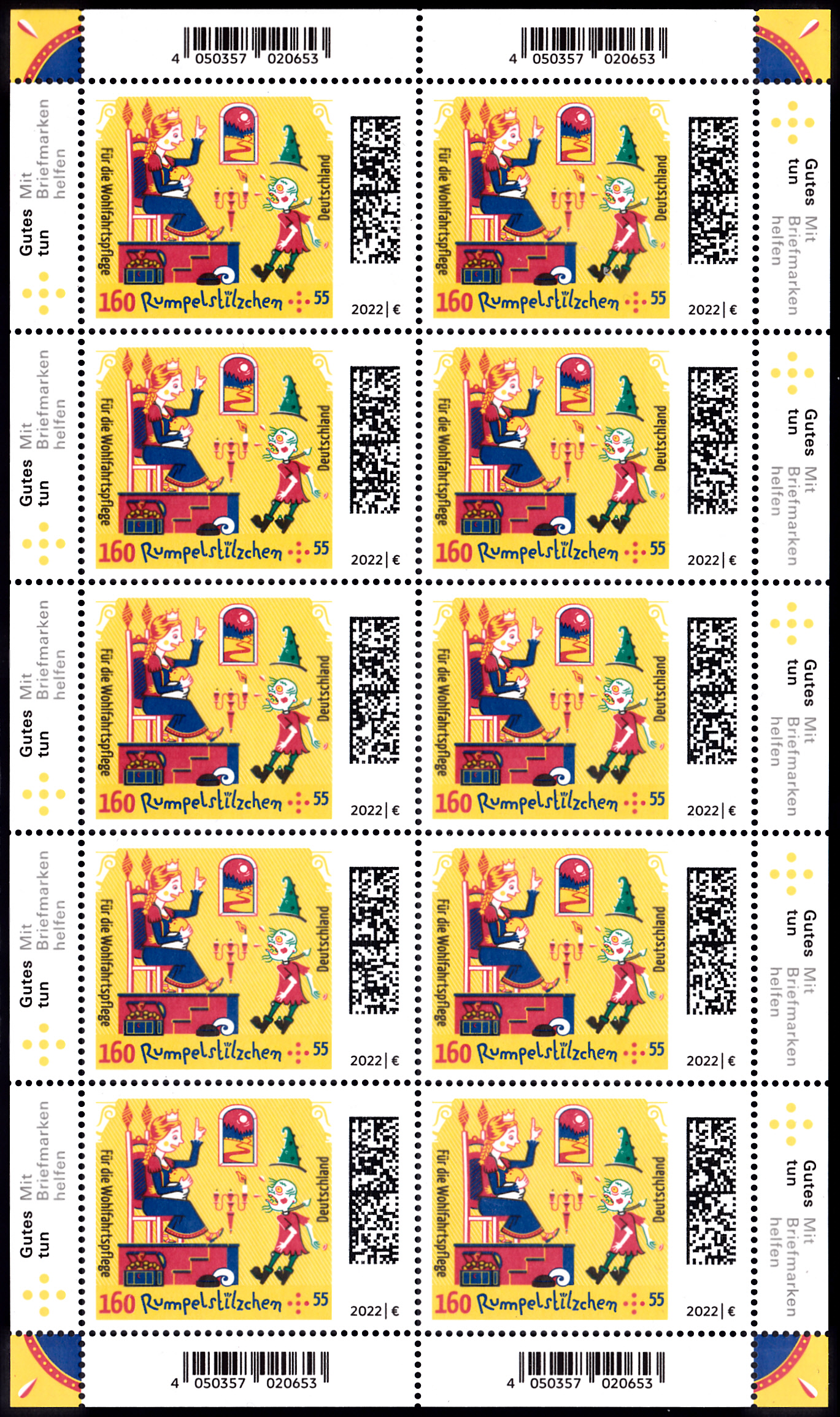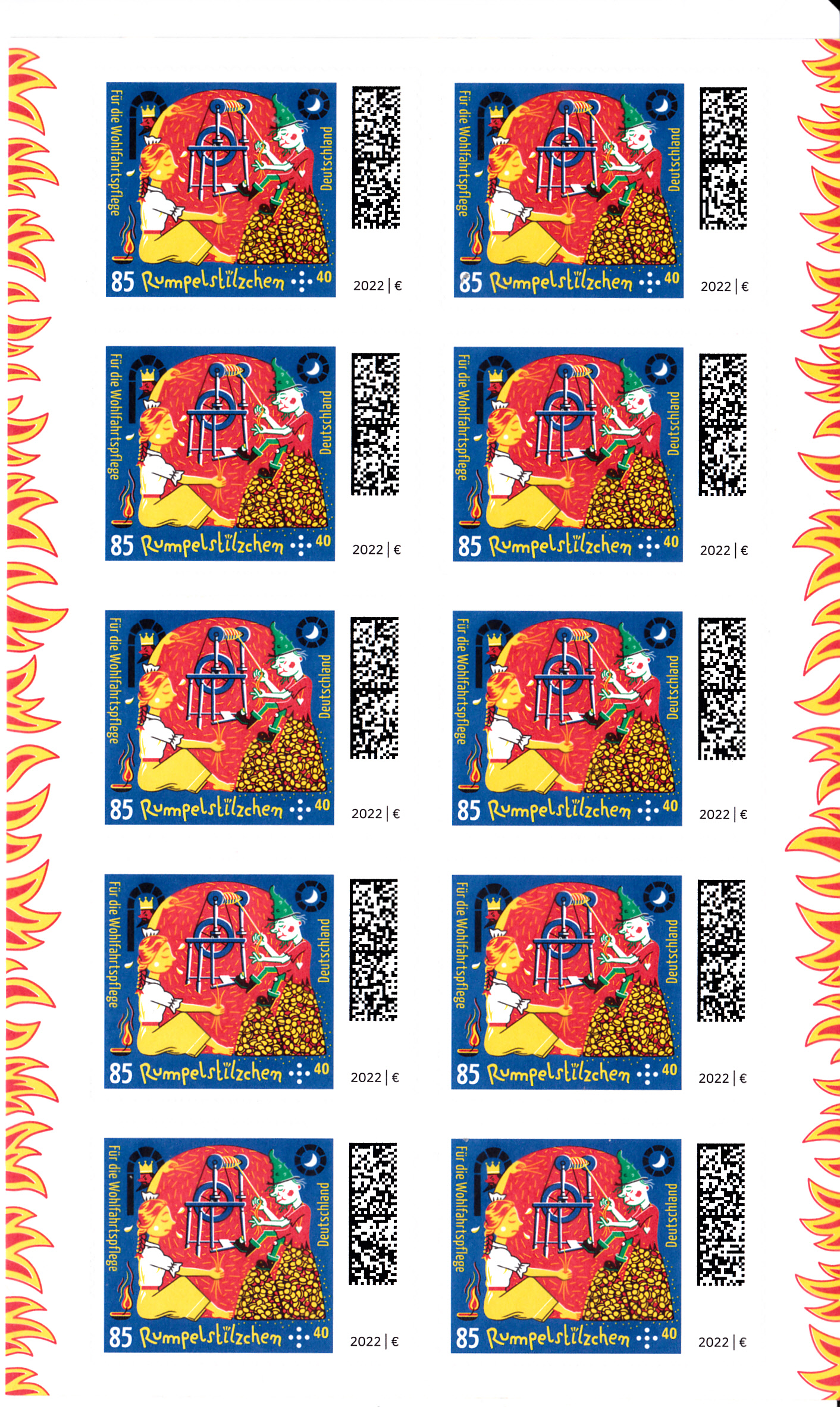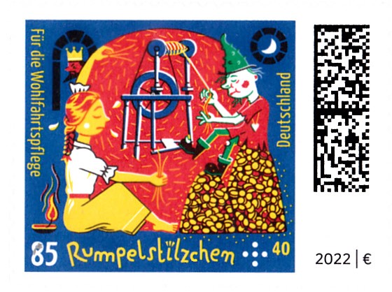 Die Marke zu 85+40Cent mit der Abbildung "Rumpelstilzchen spinnt Stroh zu Gold" gibt es auch als selbstklebende Marke (MiNr 3669) aus einem Folienblatt, als Einzelmarke aus Folienbogen und aus Folienstreifen aus der Rolle.