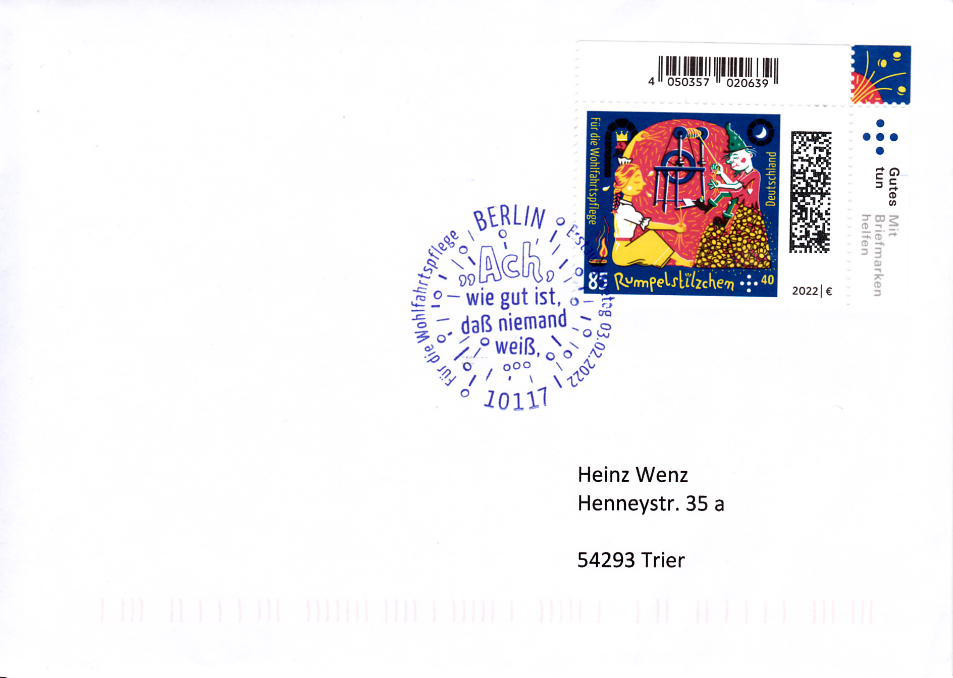 Brief mit der Marke zu 85+40Cent (MiNr 3664) und dem Ersttagsonderstempel aus Berlin.