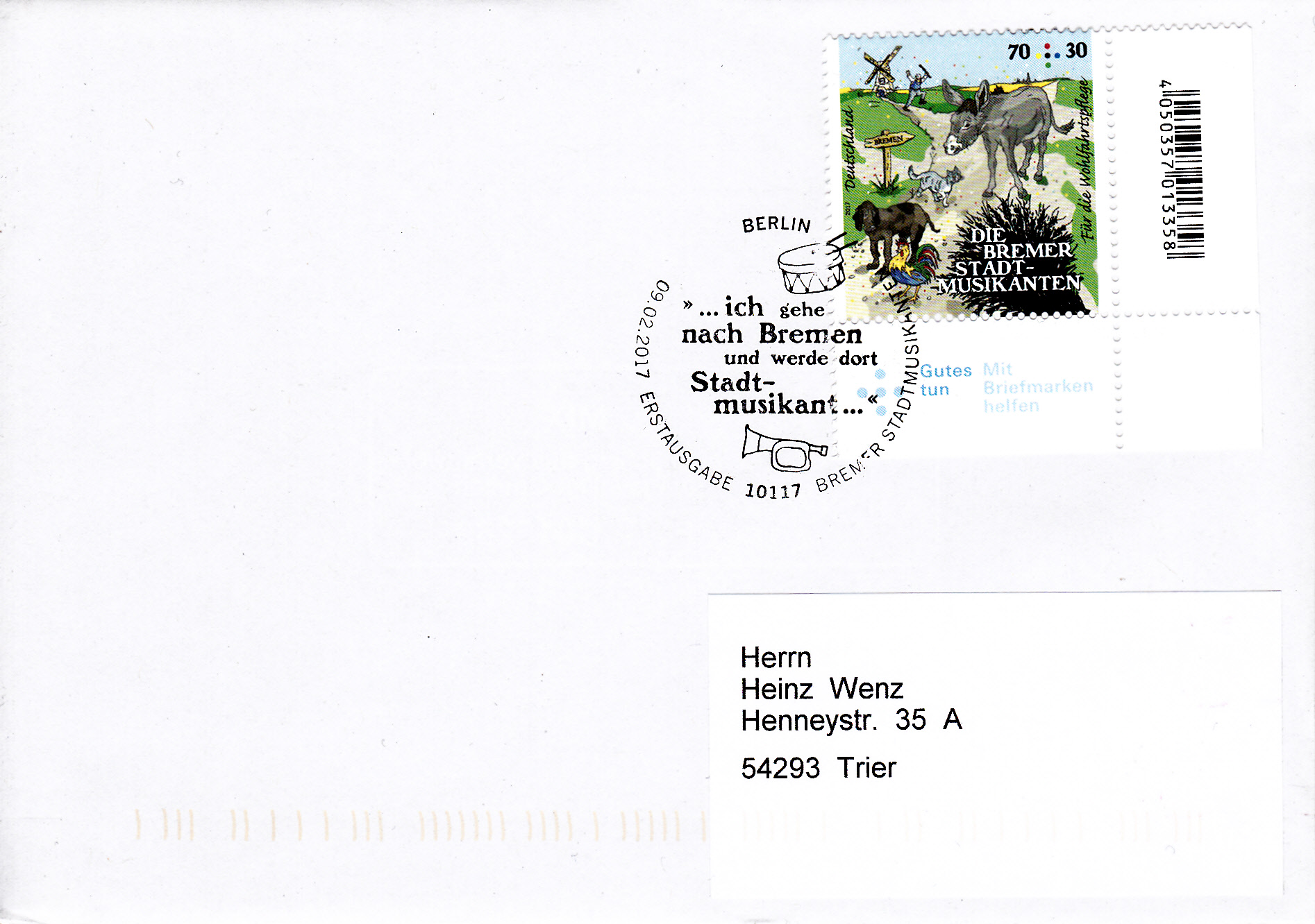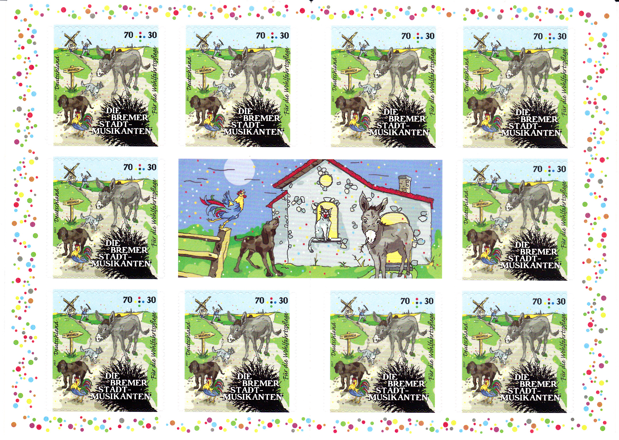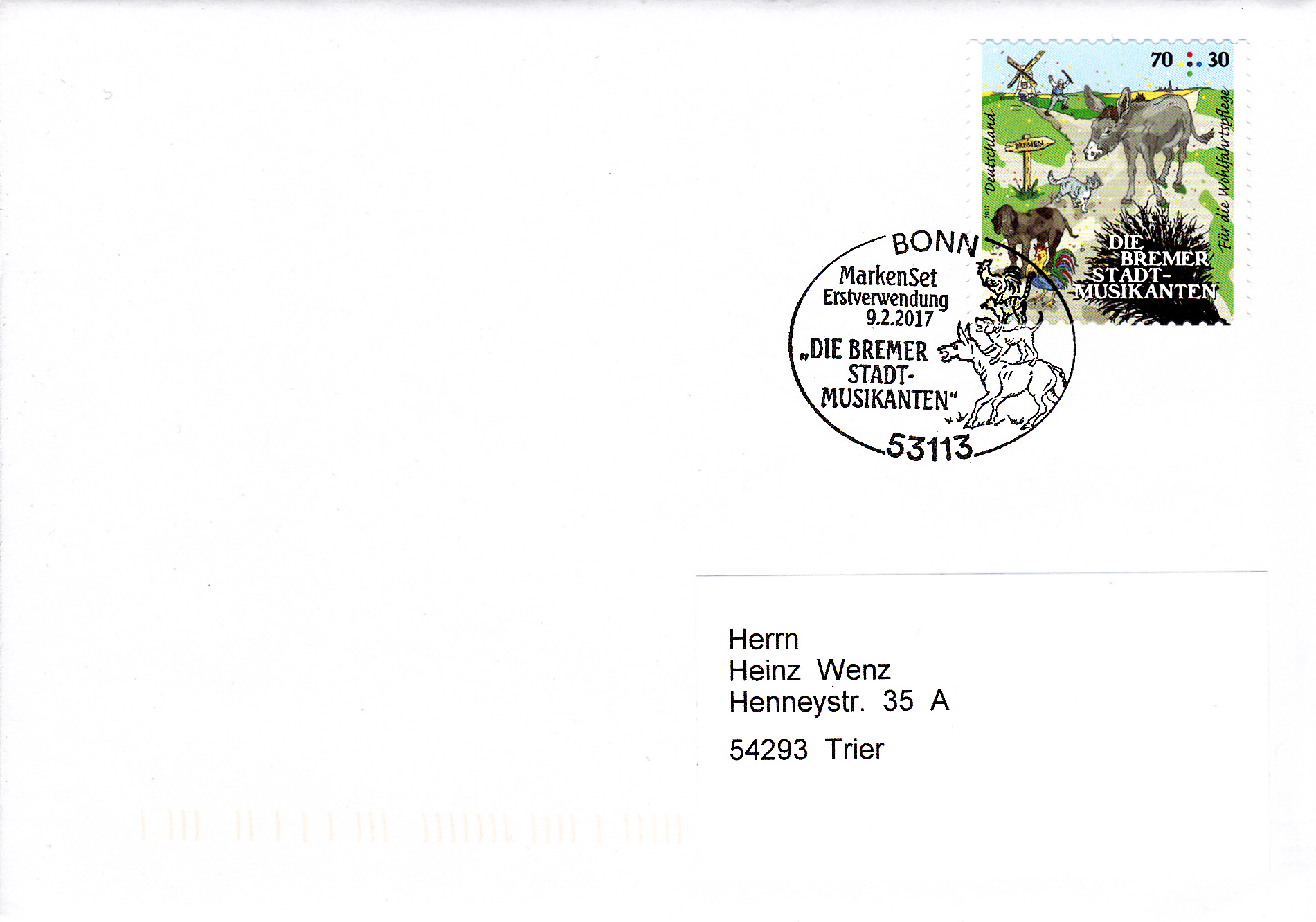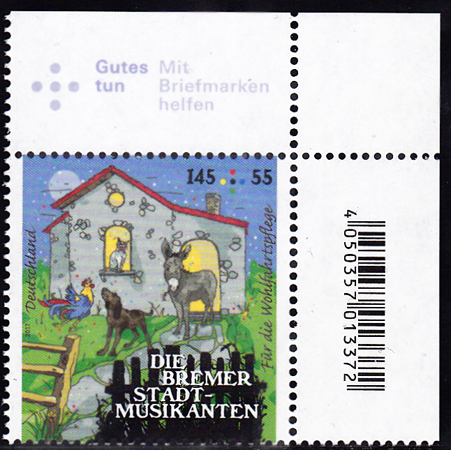 Für die selbstklebende Marke aus dem "Markenset" wurde in Bonn dieser Erstverwendungsstempel mit den Bremer Stadtmusikanten als "Tierpyramide" verwendet.