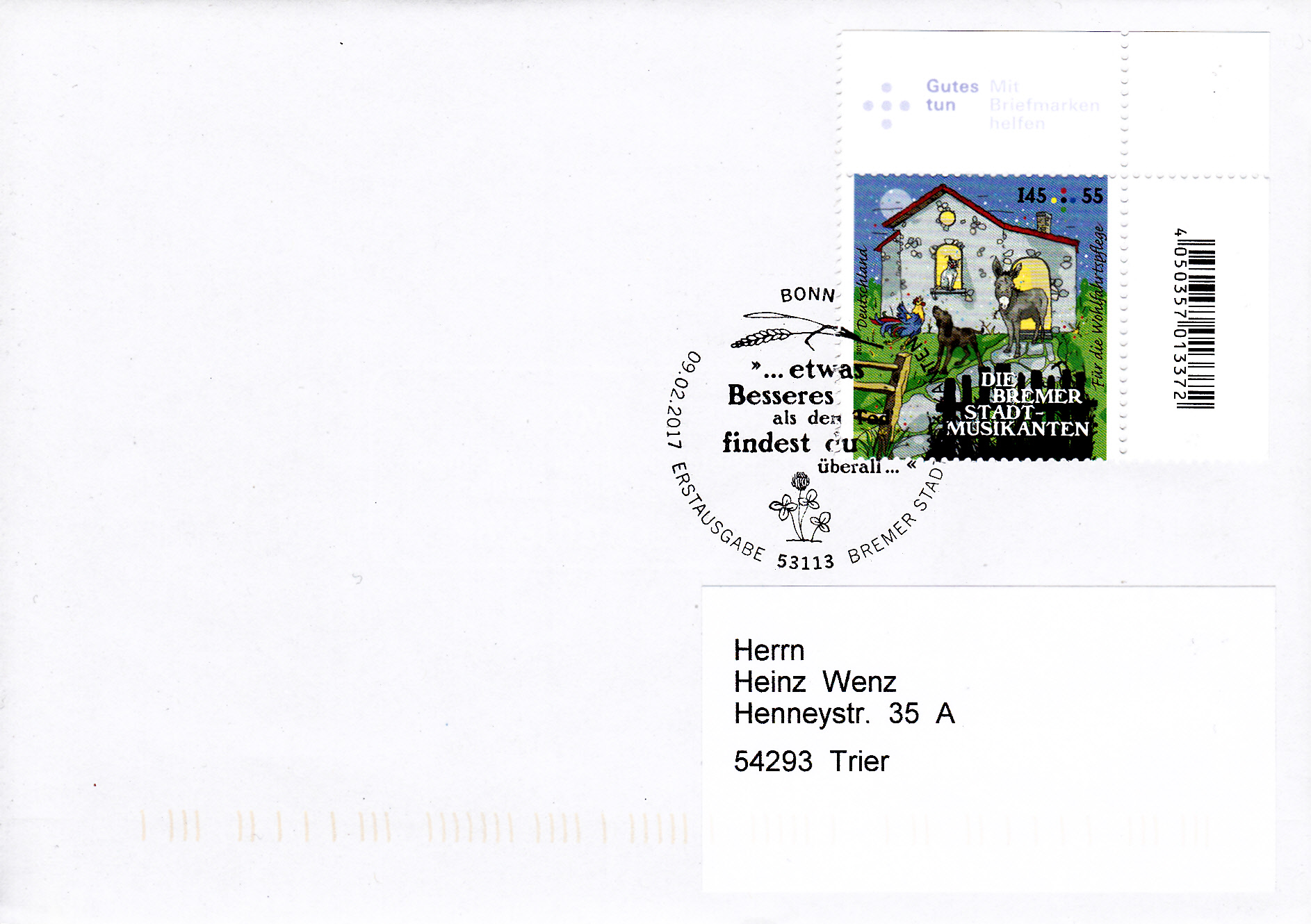 Im Ersttagsonderstempel Bonn zu dieser Ausgabe wird aus diesem Märchen eine andere Stelle zitiert: " ... etwas Besseres als den Tod findest du überall ...".