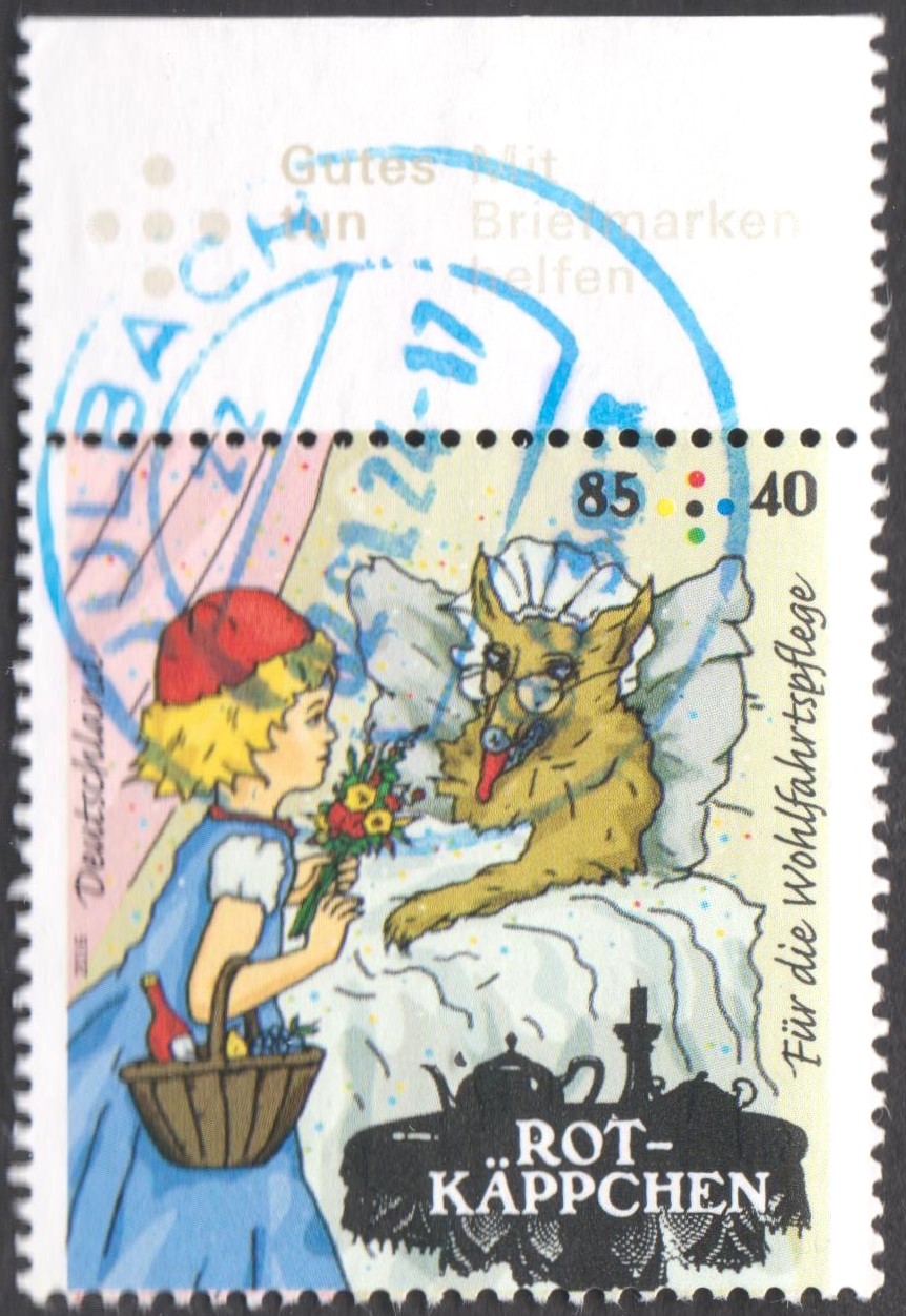 Auf der Marke zu 85+40 Cent (MiNr 3209) wird Rotkäppchen nach der Ankuft bei der Großmutter gezeigt.