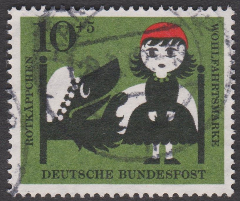 Auf einer Marke der Serie "Pro Juventute" 1985 aus der Schweiz (MiNr 1306) sehen wir Rotkäppchen nach ihrer Ankunft im Haus der Großmutter vor dem Bett mit dem Wolf.