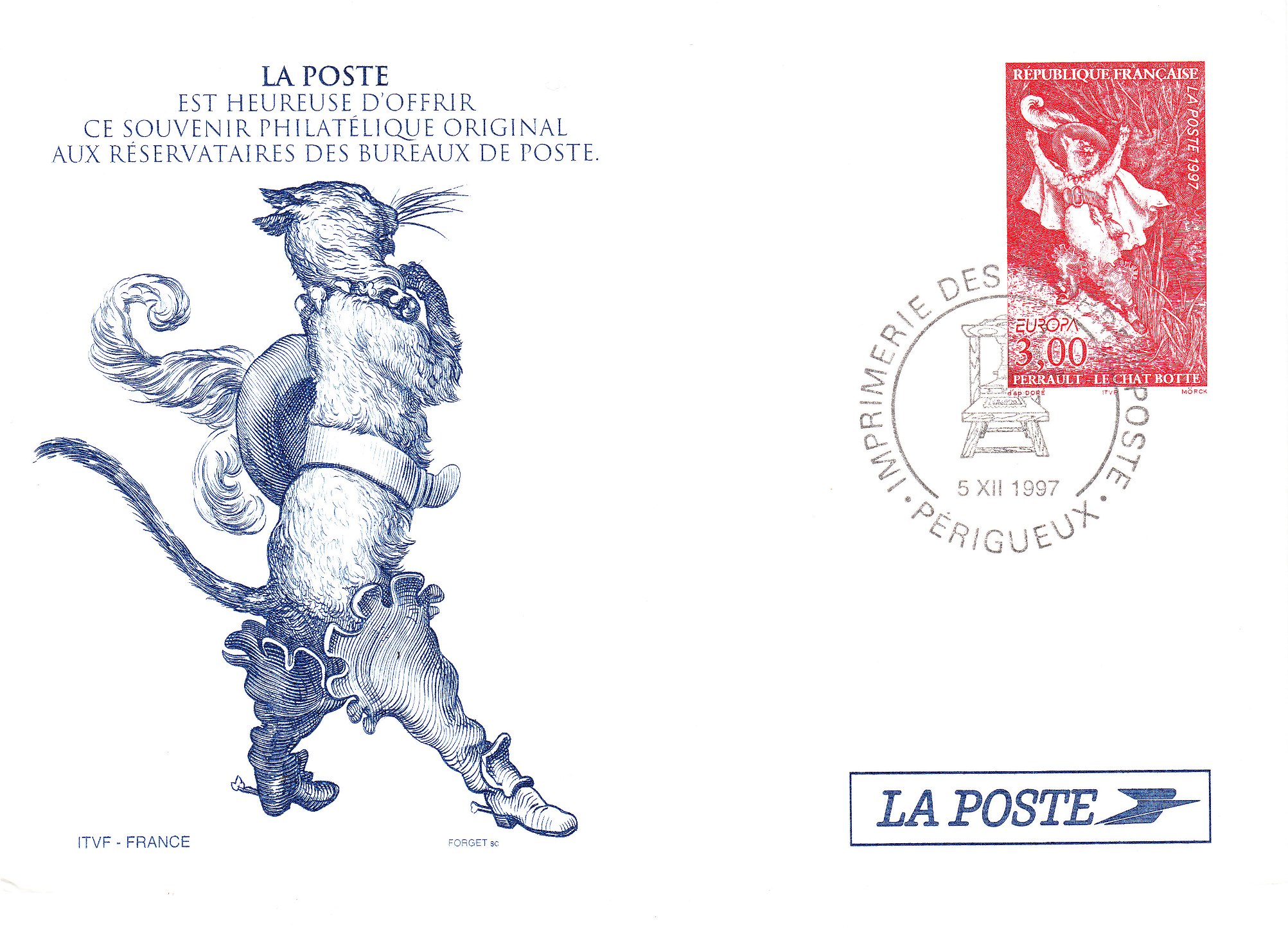 Als MiNr. 3201 erschien am 28.04.1997 als Europamarke in Frankreich diese Ausgabe mit der Darstellung des gestiefelten Katers: