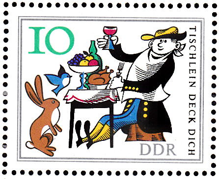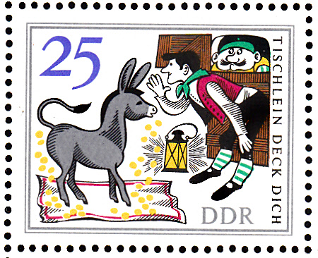 Auf der letzten Marke aus dem Bogen der DDR sehen wir die Ankunft des jüngsten Sohnes mit dem Tischlein, dem Esel und dem Knüppel aus dem Sack.