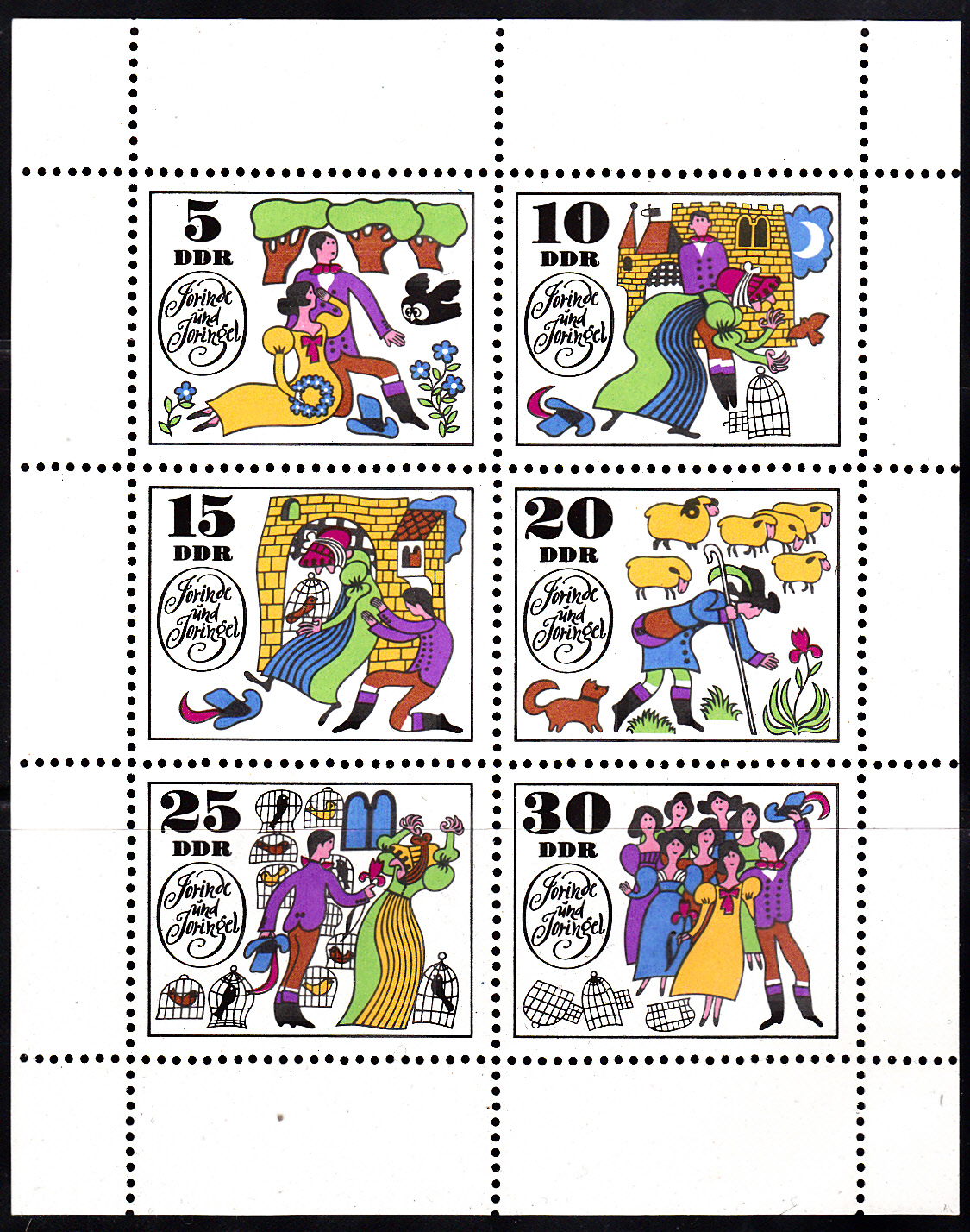 Auf der letzten Marke (MiNr 1455) sehen wir Jorinde und Joringel und einige der befreiten Jungfrauen.