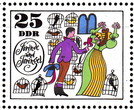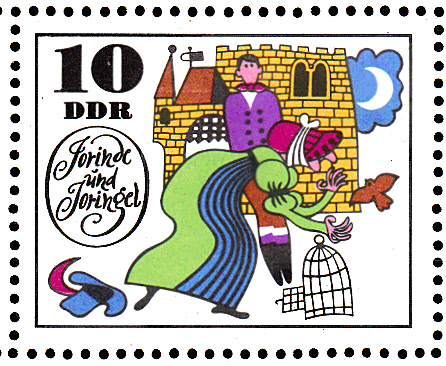 Diese Marke aus der DDR (MiNr 1450) zeigt Jorinde und Joringel im Wald und die Zauberin als Eule.