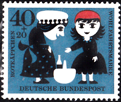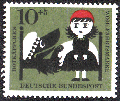 Der 10 + 5 Pfennigwert der Serie (MiNr 341) zeigt Rotkäppchen am Bett der Großmutter.