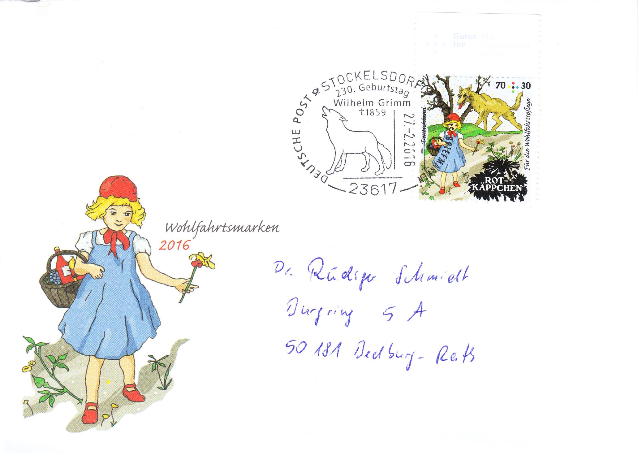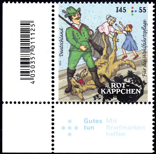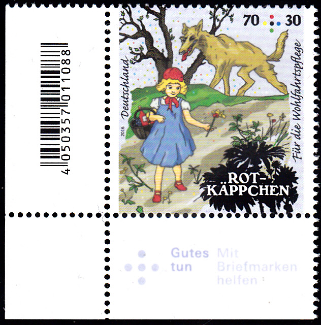 Am 11.2.2016 sind die Wohlfahrtsmarken der Deutschen Post AG mit Motiven zum Grimms Märchen "Rotkäppchen" erschienen. Hier ein Eckrandstück der Marke zu 70+30 Cent mit dem Motiv "Im Wald", das Rotkäppchen beim Sammeln von Blumen zeigt.