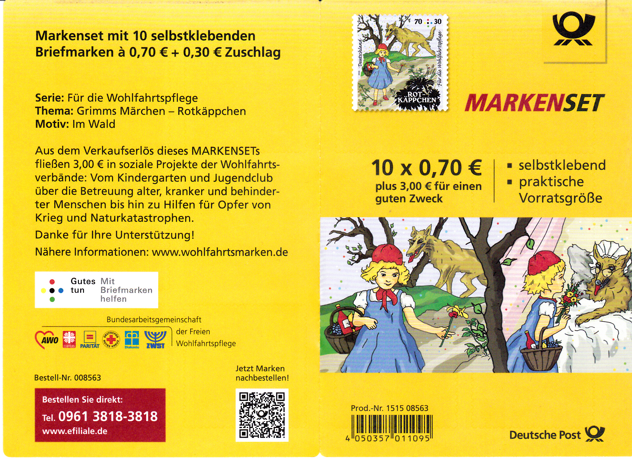 Auf der Marke zu 85+40 Cent (MiNr 3209) wird Rotkäppchen nach der Ankuft bei der Großmutter gezeigt. Der Wolf liegt als "Großmutter" im Bett. Hier ein Eckrandstück dieser Marke: