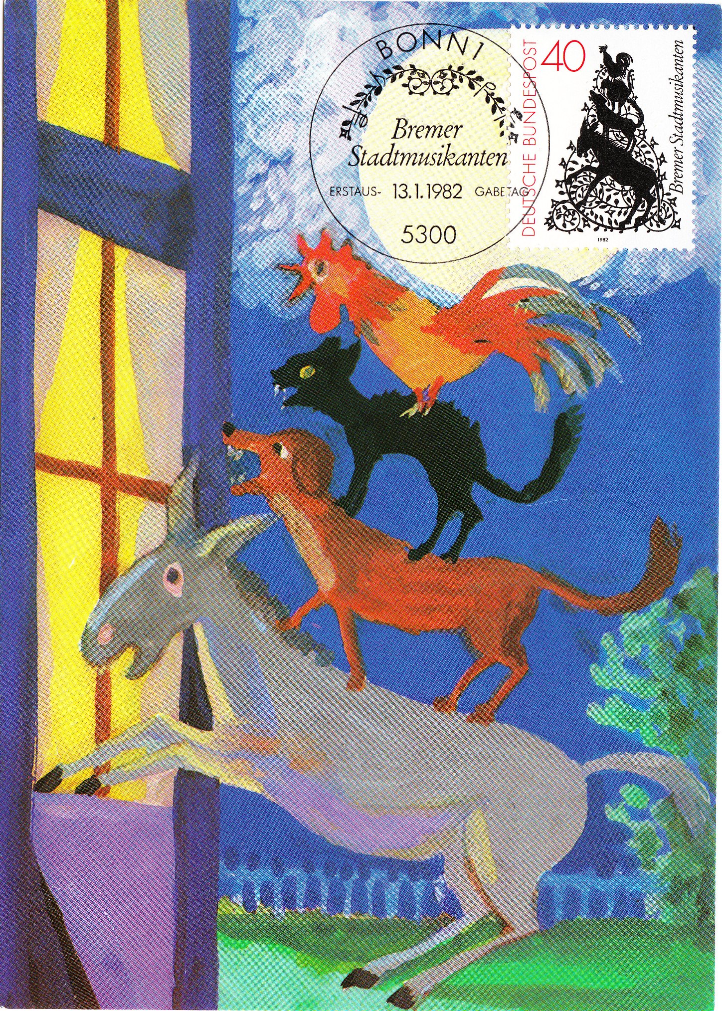 Auf dem Weg durch einen Wald kamen sie an ein Haus, in dem sich eine Räuberbande aufhielt. Die vier Tiere erschrecken und vertreiben die Räuber und leben von da an glücklich in diesem Haus.