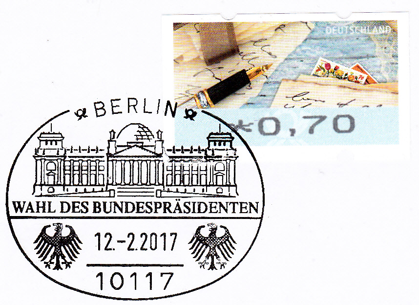 Zur Wahl des Bundespräsidenten wurde am 12.2.22017 in Berlin dieser Sonderstempel mit der Abbildung des Reichstages geführt.