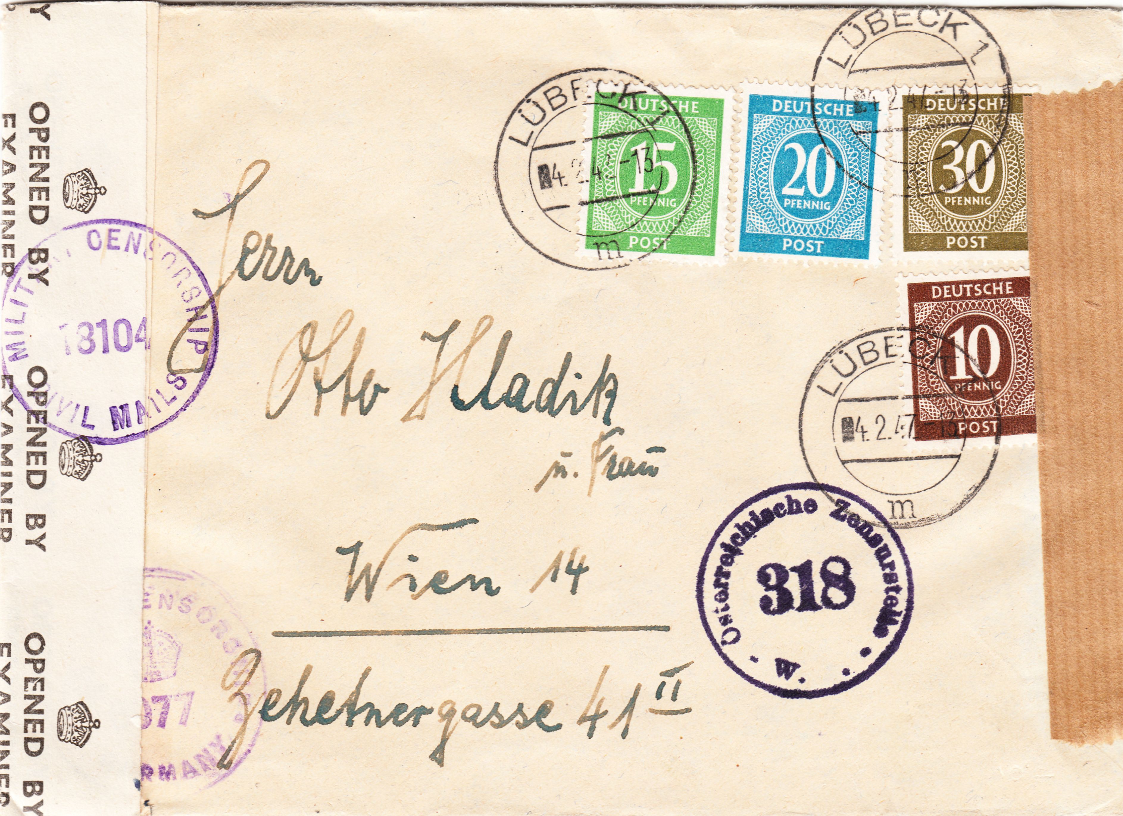 Dieser nach Wien adressierte, am 04.02.1947 in Lübeck aufgegebene Brief lief durch die britische Zensurstelle in Hamburg, wo er zweimal linksseitig geöffnet und per Verschlußzettel wieder verschlossen wurde: