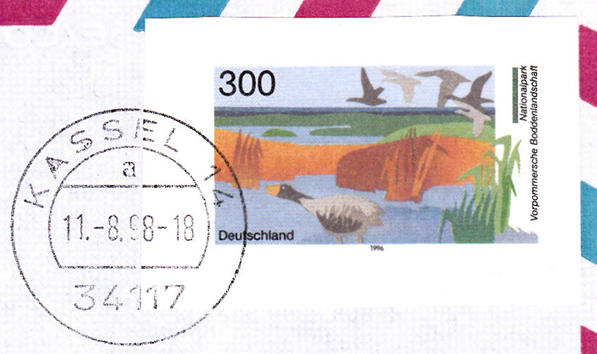 Dieser Luftpostbrief von Kassel nach Chicago (USA) wurde mit einem Ganzsachenausschnitt zu 300Pf im Muster der Marke MiNr 1873 der Deutschen Post frankiert. Dieser Wertstempel wurde aus einem Luftpostganzsachenumschlag (MiNr USo 3 oder USo 7) ausgeschnitten und auf diesen Luftpostumschlag als Frankatur aufgeklebt. Das Porto eines Standardbriefes mit Luftpost in die USA betrug zu dieser Zeit 300Pf, somit ist der Umschlag portogerecht frankiert.