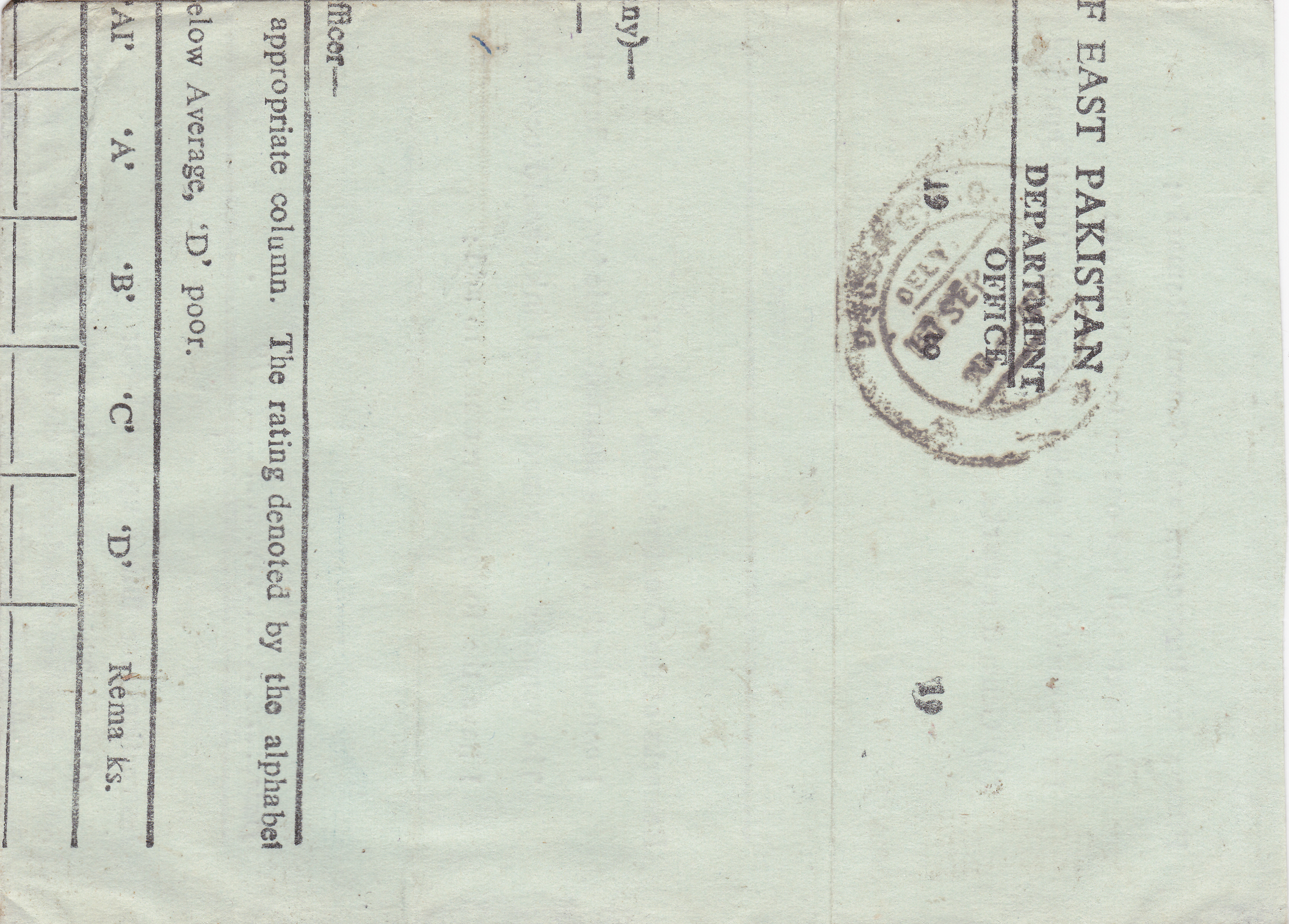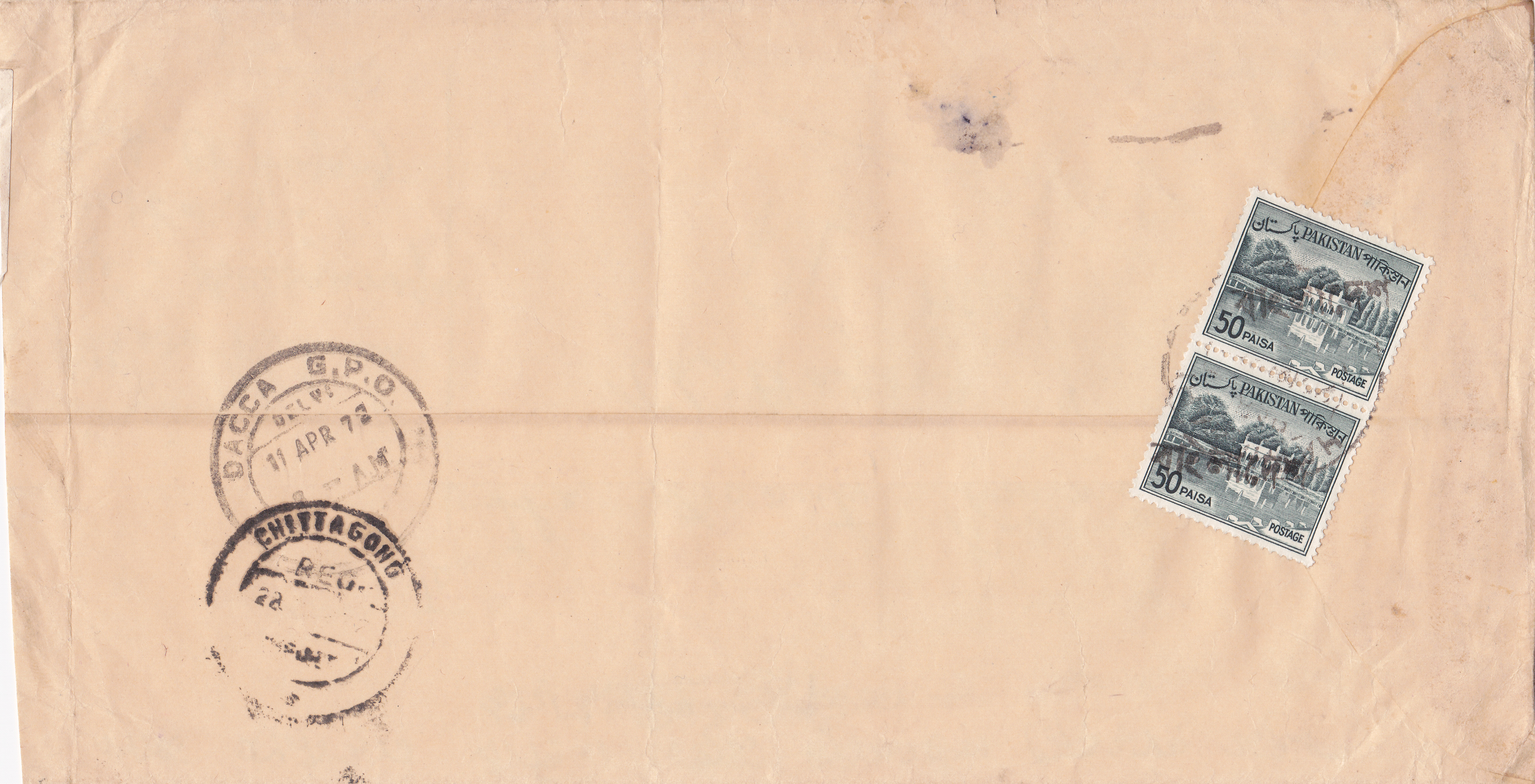 Zunächst für einen Einschreibebrief von Hathazari (District Chittagong) an den „Deputy Commissioner“ in Chittagong. Der Einschreiben Postaufgabe Stempel NATHASAR(I) ist unten rechts angebracht, die Nummer des Einschreibens ist mit den beiden 13 Paisa-Marken überklebt worden, das Datum der Aufgabe ist noch zu lesen. Die Frankatur mit zwei 50 Paisa Marken ist auf der Rückseite verklebt. Der Zustellstempel Chittagong ist auf der Rückseite abgeschlagen. Der Umschlag wurde geöffnet und wieder verwendet für einen Dienstbrief nach Dacca. Die neue Anschrift wurde auf eine Adressenfahne geschrieben und aufgeklebt. Die Frankatur zeigt zwei 7 Paisa und zwei 13 Paisa Dienstmarken (Aufdruck in rot: SERVICE) Auf der alten Fahne ist noch zu lesen ON PAKISTAN STATE SERVICE, darunter ist ein Stempel in Bengali zu sehen, der dies in Bangladesch State Service ändert. Der Zustellstempel ist auf der Rückseite zu sehen (Dacca 11.April 72)
