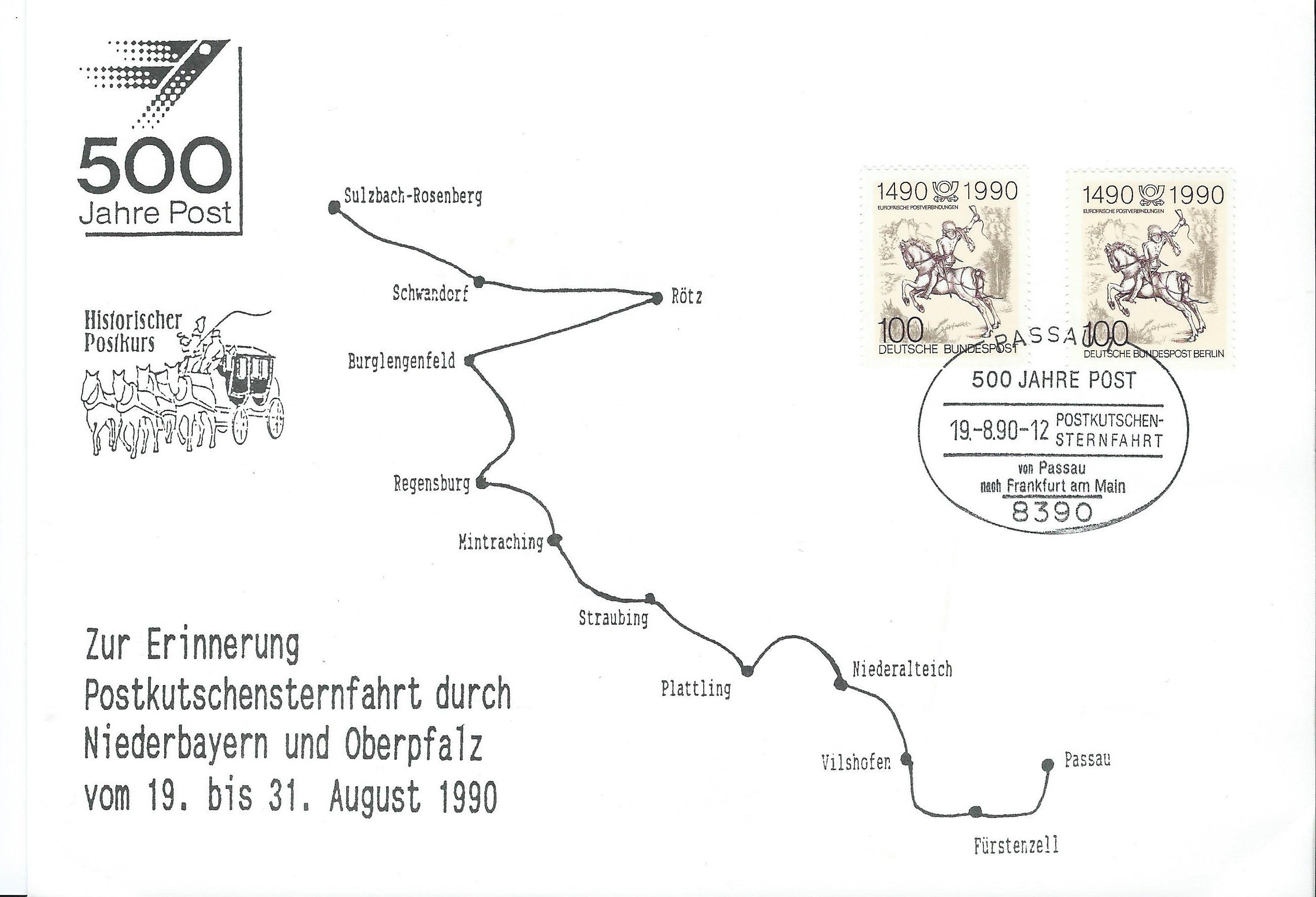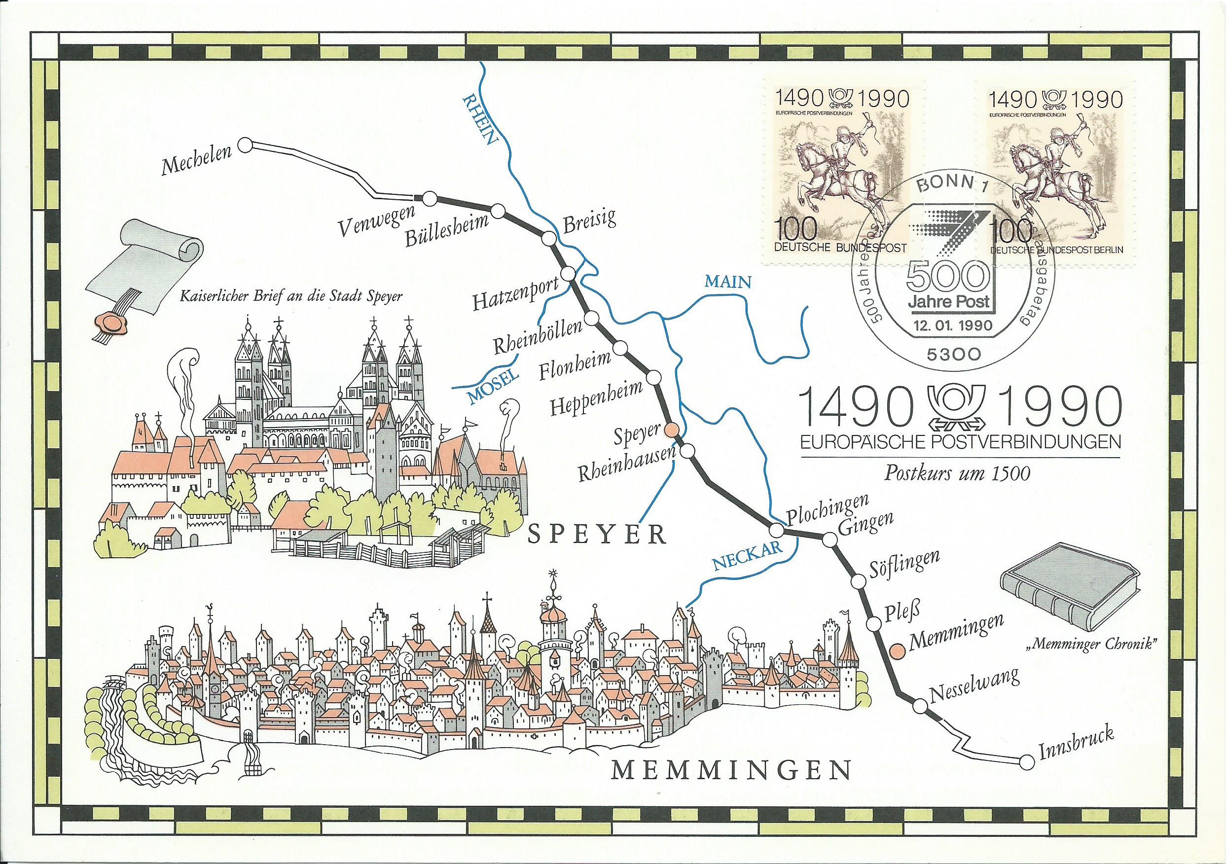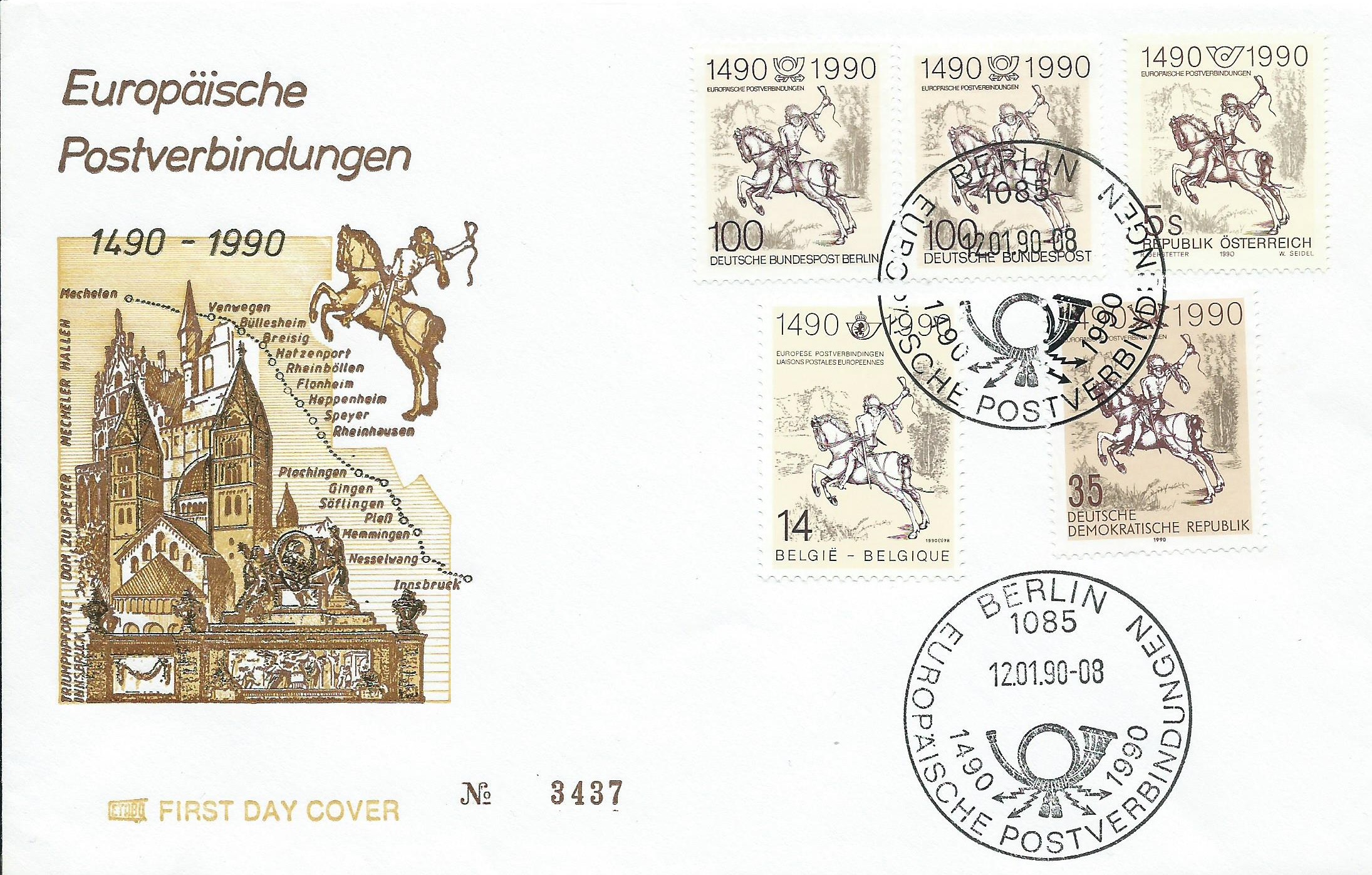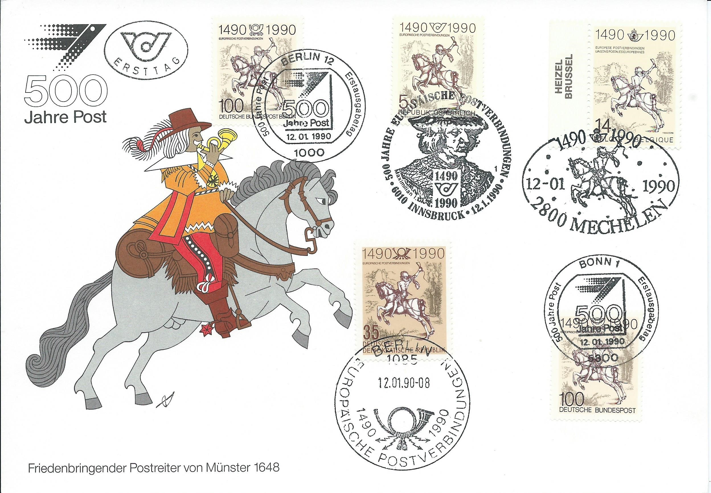 Hier haben wir einen Brief, auf dem auch wieder alle motivgleichen Marken verklebt wurden. Allerdings wurde hier nur mit einem, dem Sonderstempel aus der DDR, genauer aus Ost-Berlin vom 12.1.90, gestempelt. Das scheint ja erstaunlicherweise seinerzeit erlaubt gewesen zu sein, oder ist das aus Unkenntnis der Postler entstanden? Hat darüber jemand Erkenntnisse?