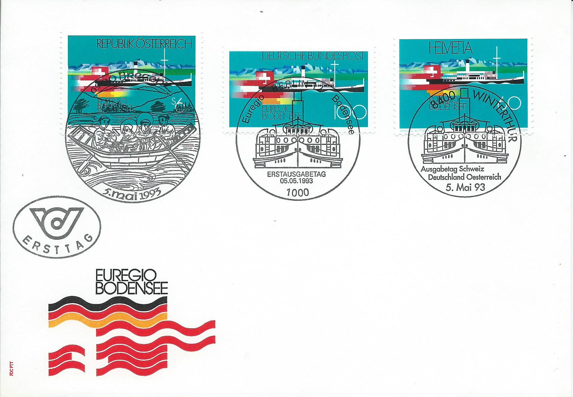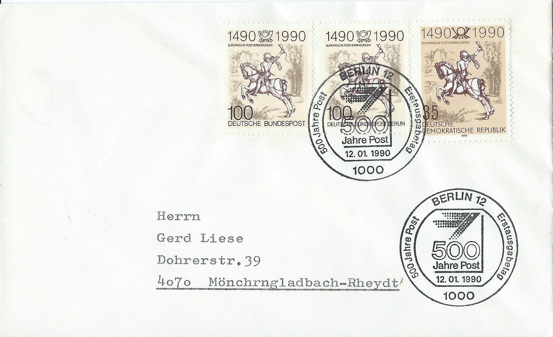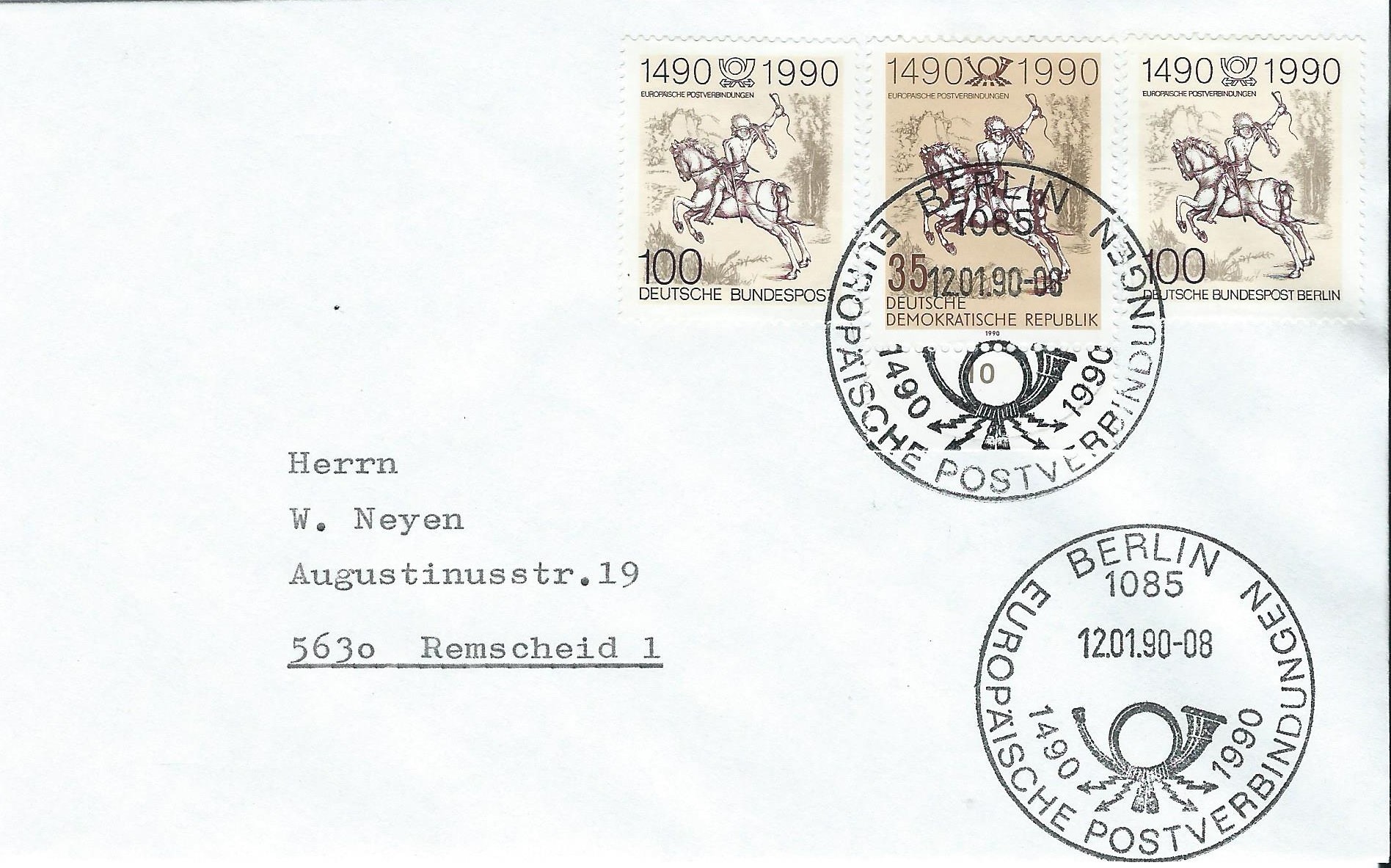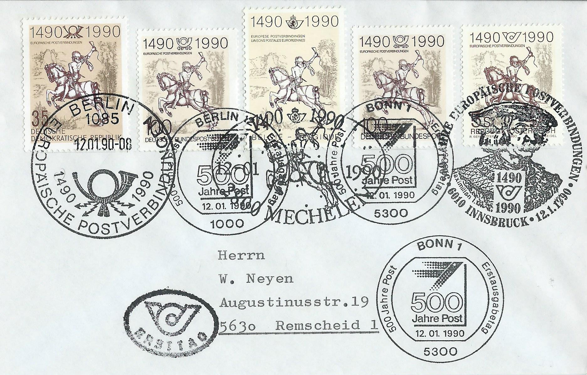 Am 12.1.1990 war der Ausgabetag für die Marke 500 Jahre Internationale Postverbindungen in Europa. Das Markenmotiv zeigt „Der kleine Postreiter“ von Albrecht Dürer. Hierzu kann ich als Ergänzung zu den bereits auf der 3. Und 4. Seite gezeigten Belegen einen Beleg zeigen, der gleich 5 verschiedene Ausgaben trägt: DDR, Deutsche Bundespost Berlin, Belgien, Deutsche Bundespost und Österreich. Jede einzelne Marke wurde mit dem jeweiligen Ersttagssonderstempel gestempelt. DDR mit Berlin 1085, Berlin mit dem Berliner Ersttagsstempel, Belgien mit Mechelen, Bund mit Bonn und Österreich trägt den Ersttagssonderstempel von Innsbruck. Ein schönes Zeitdokument!
