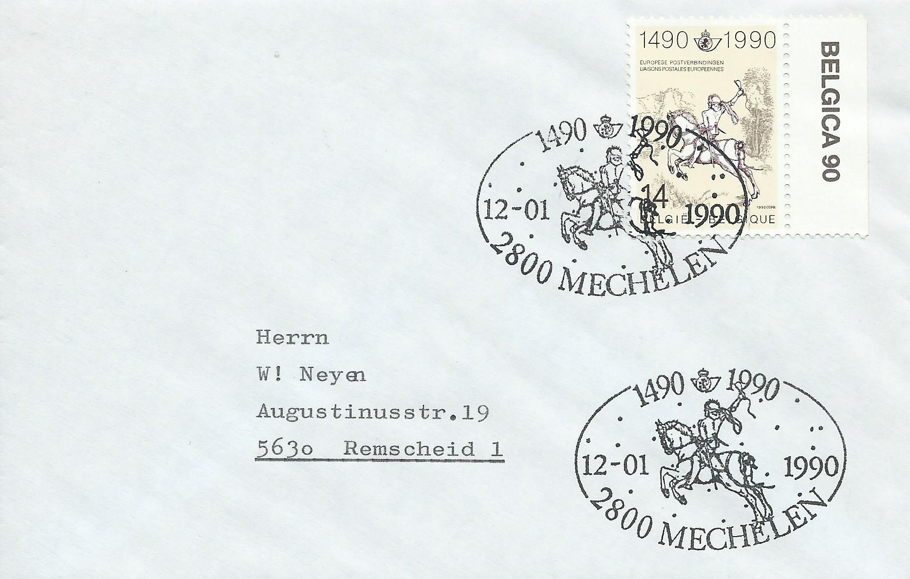 Die Marke von Belgien mit entsprechendem Ersttagssonderstempel von Mechelen: