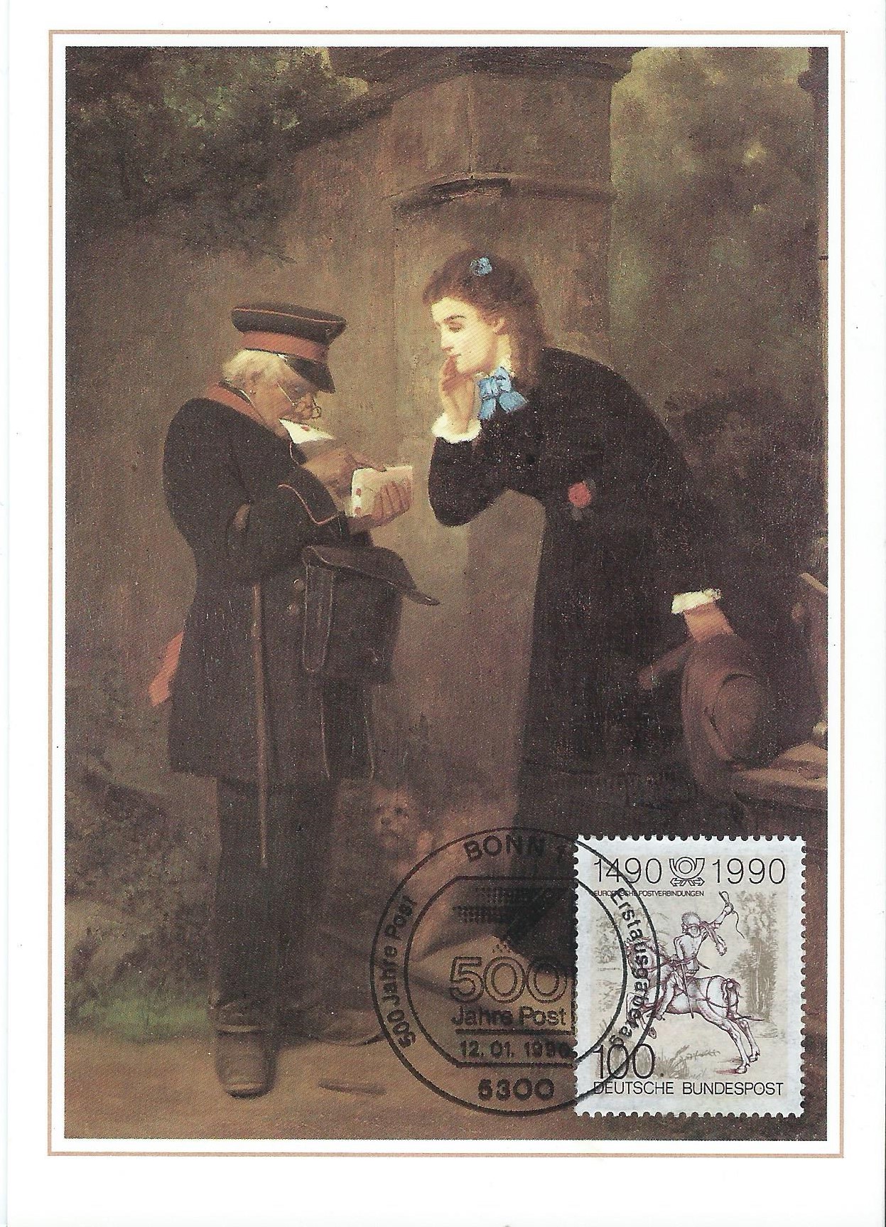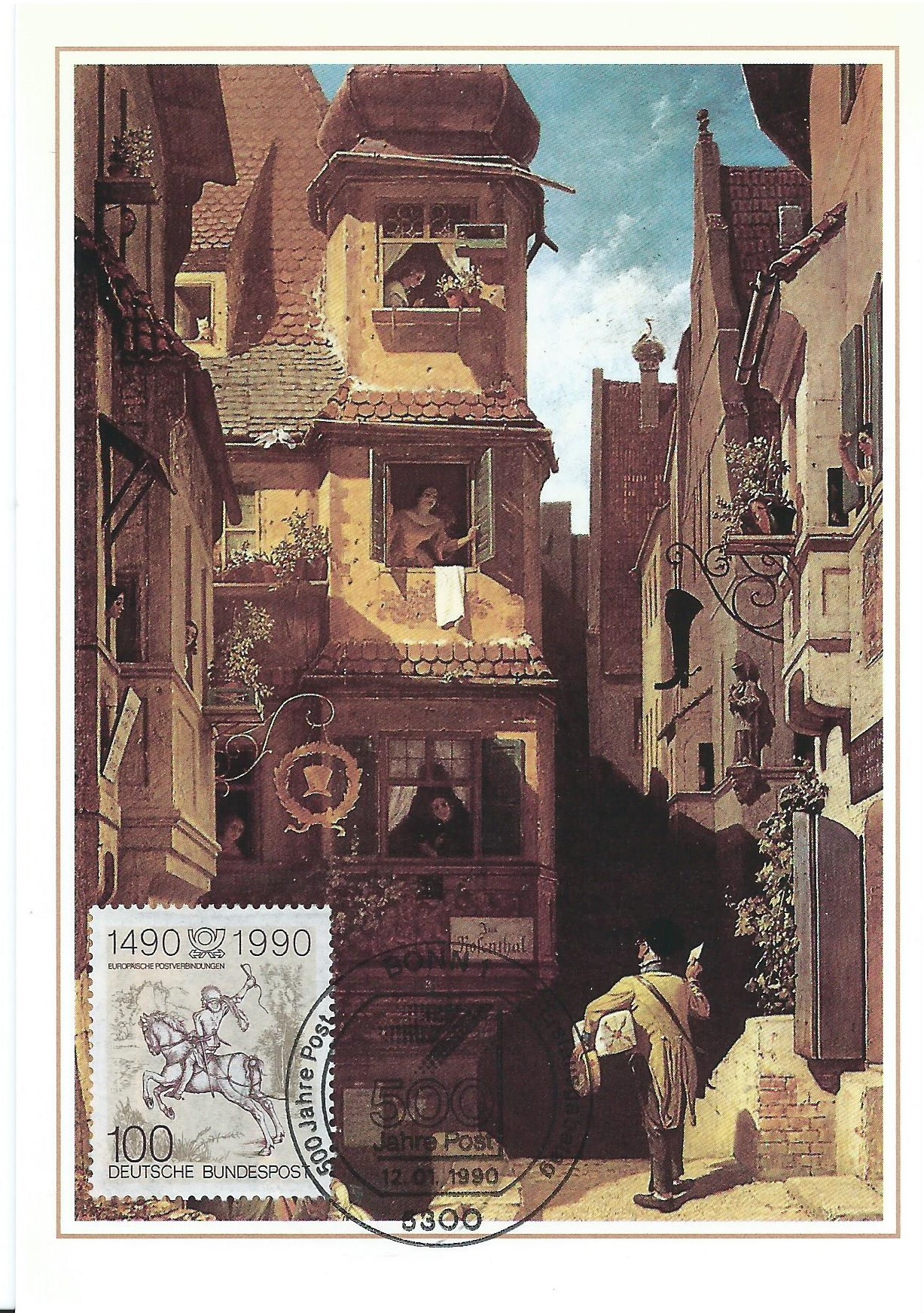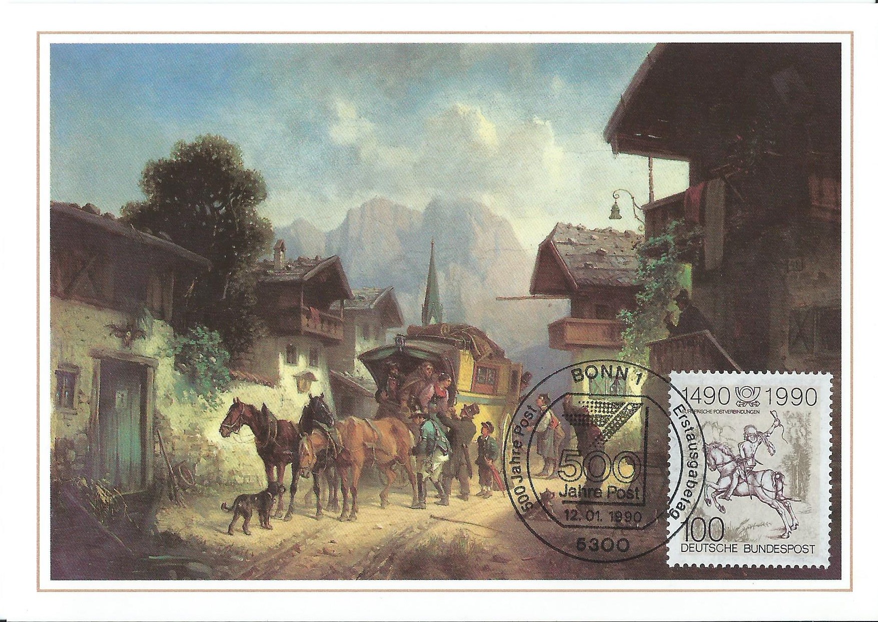 mit der Marke „Postreiter“ der Ausgabe Bund kann ich noch einige passende Themenkarten zeigen. Sie wurden seinerzeit alle zum Thema 500 Jahre Post verausgabt und sie Marken wurden jeweils mit dem Ersttagssonderstempel Bonn vom 12.1.90 gestempelt.
