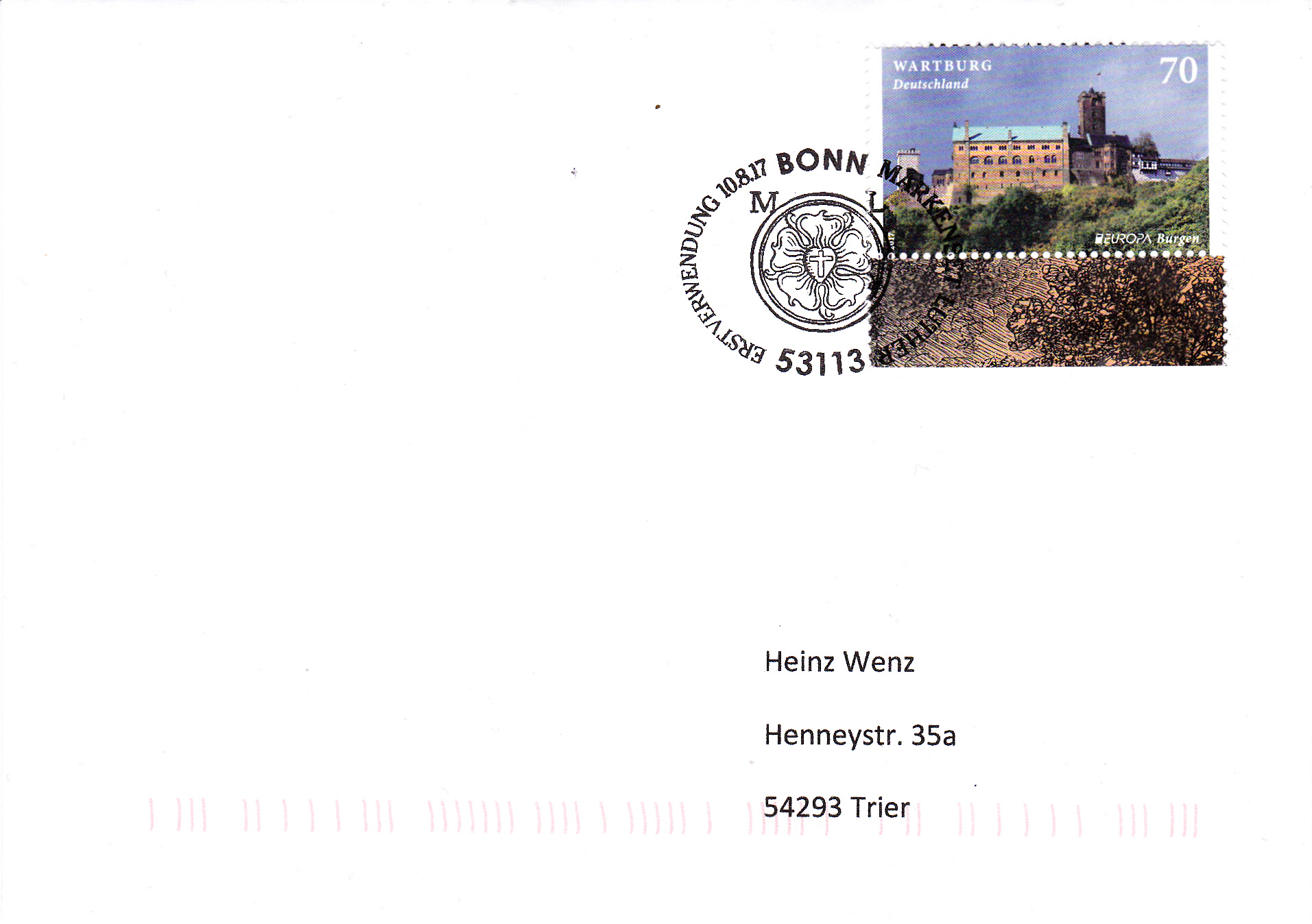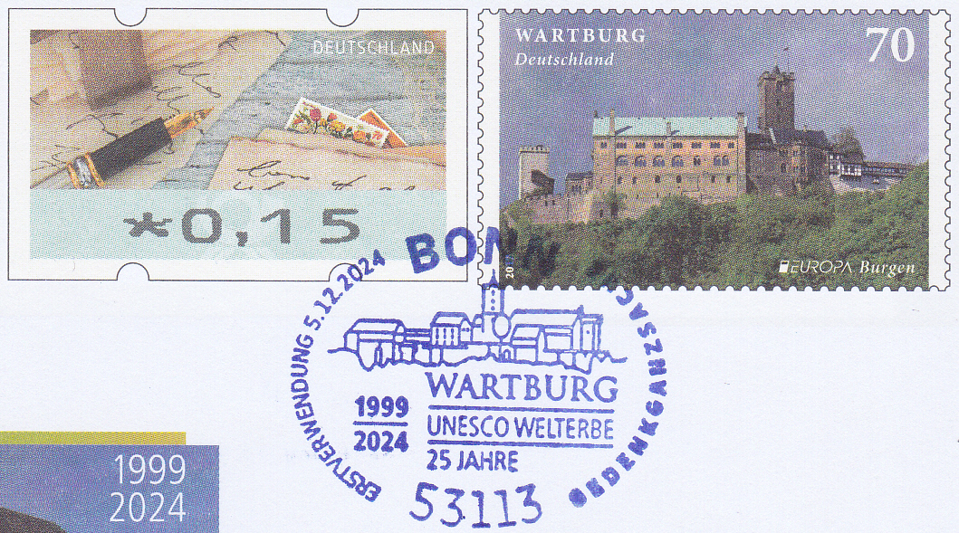 Diese Gedenk-Ganzsache mit dem Wertstempel im Muster der Europamarke 2017 (MiNr 3310) mit der Wartburg und einer Automatenmarke zu 0,15€ wurde mit dem Erstverwendungsstempel Bonn gestempelt.