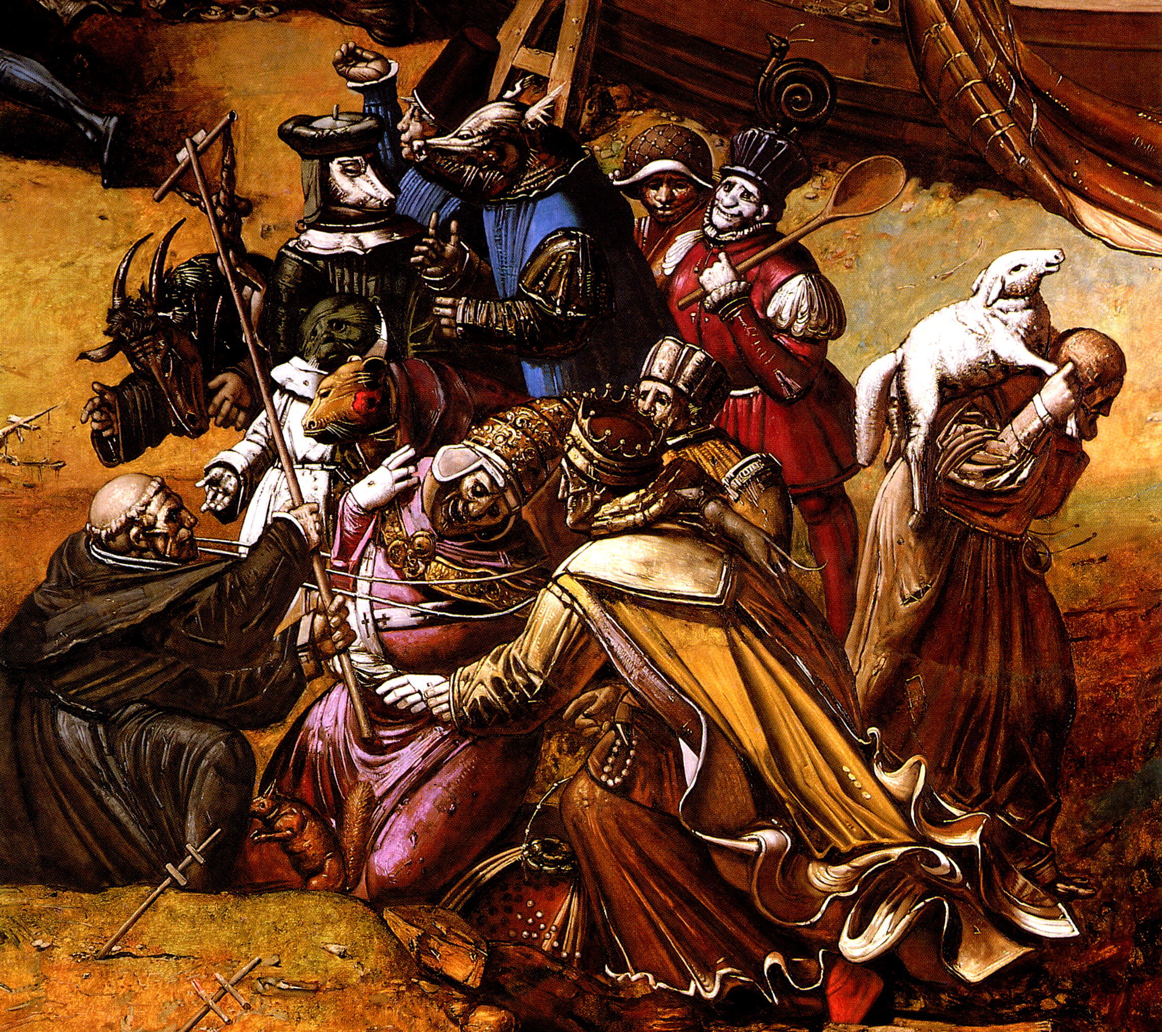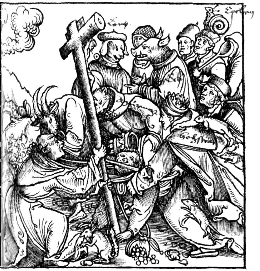 In diesem Beispiel hat die Darstellung einen religiösen Hintergrund, denn links, das Kreuz haltend, wurde Martin Luther dargestellt, während rechts seine katholischen Widersacher als Tiere dargestellt wurden.