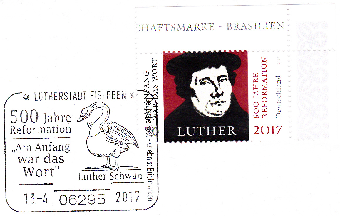 In der Lutherstadt Eisleben wurde am 13.4.2017 dieser Sonderstempel mit einem "Lutherschwan" geführt.