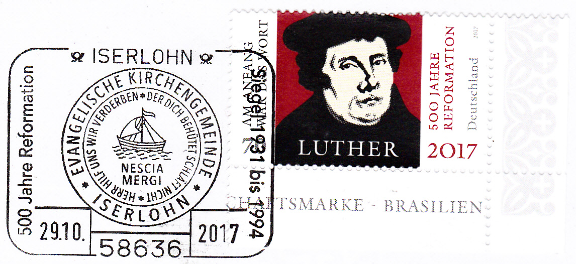 Im Sonderstempel vom 29.10.2017 aus Iserlohn wird das Siegel der Evangelischen Kirchengemeinde Iserlohn von 1931 bis 1994 mit zwei Zitaten aus der Lutherbibel von 1912 gezeigt.