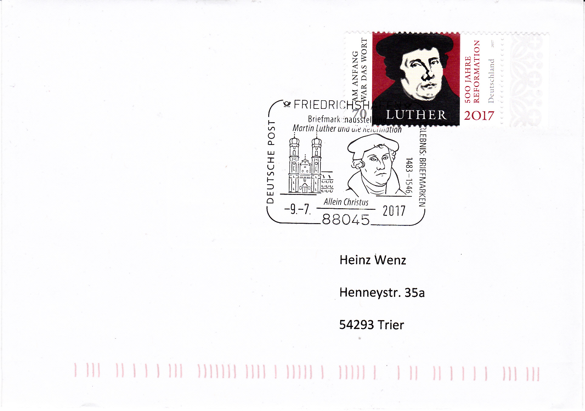 Die Marke der Deutschen Post AG zum Thema "500 Jahre Reformation" vom 13. April 2017 (MiNr 3300) wurde am 10. August 2017 zusammen mit der Europamarke 2017 (MiNr 3310) in einem Markenheftchen (MiNr MH 107) nur über die Postphilatelie Weiden verkauft.