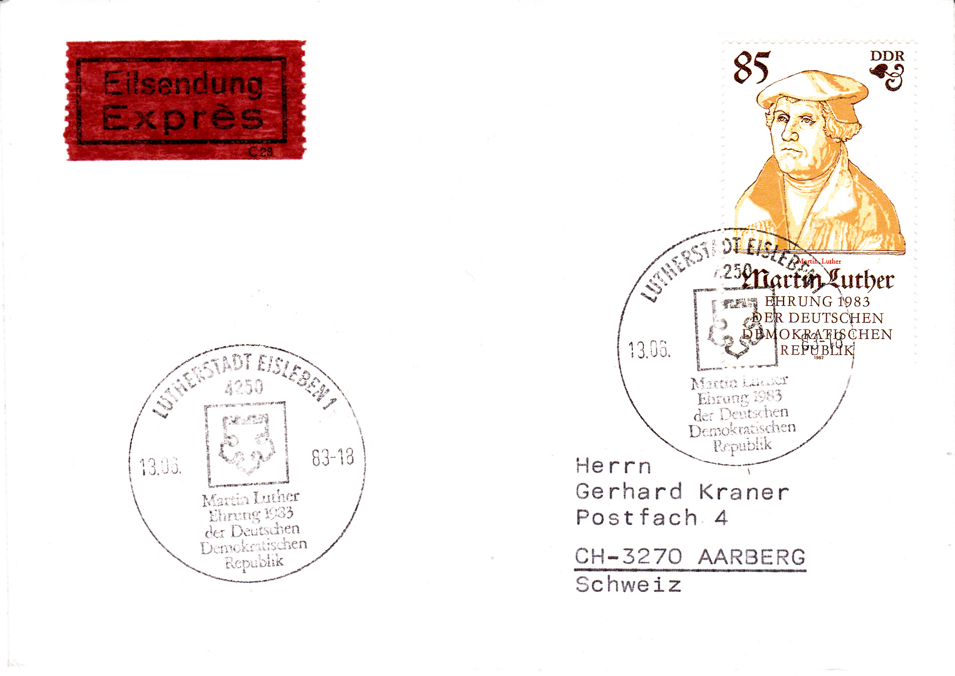 Die bereits hier gezeigte Marke aus der DDR zu 85Pf zum 500. Geburtstag von Martin Luther (MiNr 2757) wurde auf diesem Brief per Eilboten nach Aarberg in der Schweiz als Porto verwendet und mit einem Sonderstempel zum Lutherjahr 1983 in Eisleben gestempelt. Das Porto betrug für einen Brief ins Ausland bis 20g 35Pf und der Zuschlag als Eilsendung 50Pf, zusammen also 85Pf.