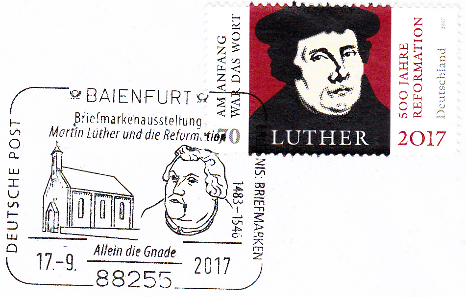 Sonderstempel vom 17.9.2017 aus Baienfurt zu der weitergezogenen Briefmarkenausstellung "Martin Luther und die Reformation". Im Stempel wird neben der evangelischen Kirche Baienfurt auch ein Porträt von Martin Luther gezeigt.