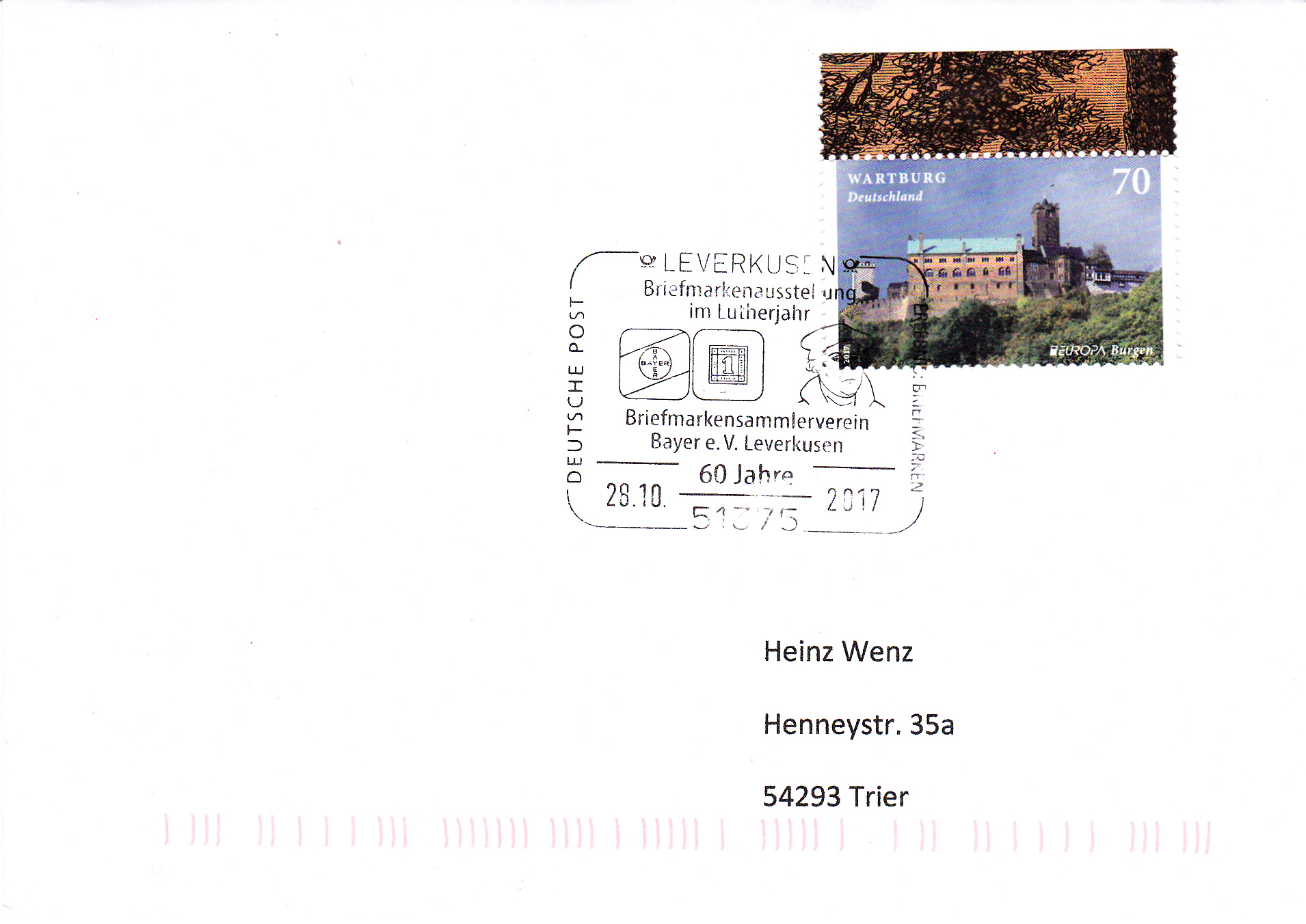 Im Sonderstempel vom 16-9-2017 aus Greifswald zu einer Briefmarkenschau "Reformation und Humanismus" wird Martin Luther im rechten Teil des Stempels gezeigt.