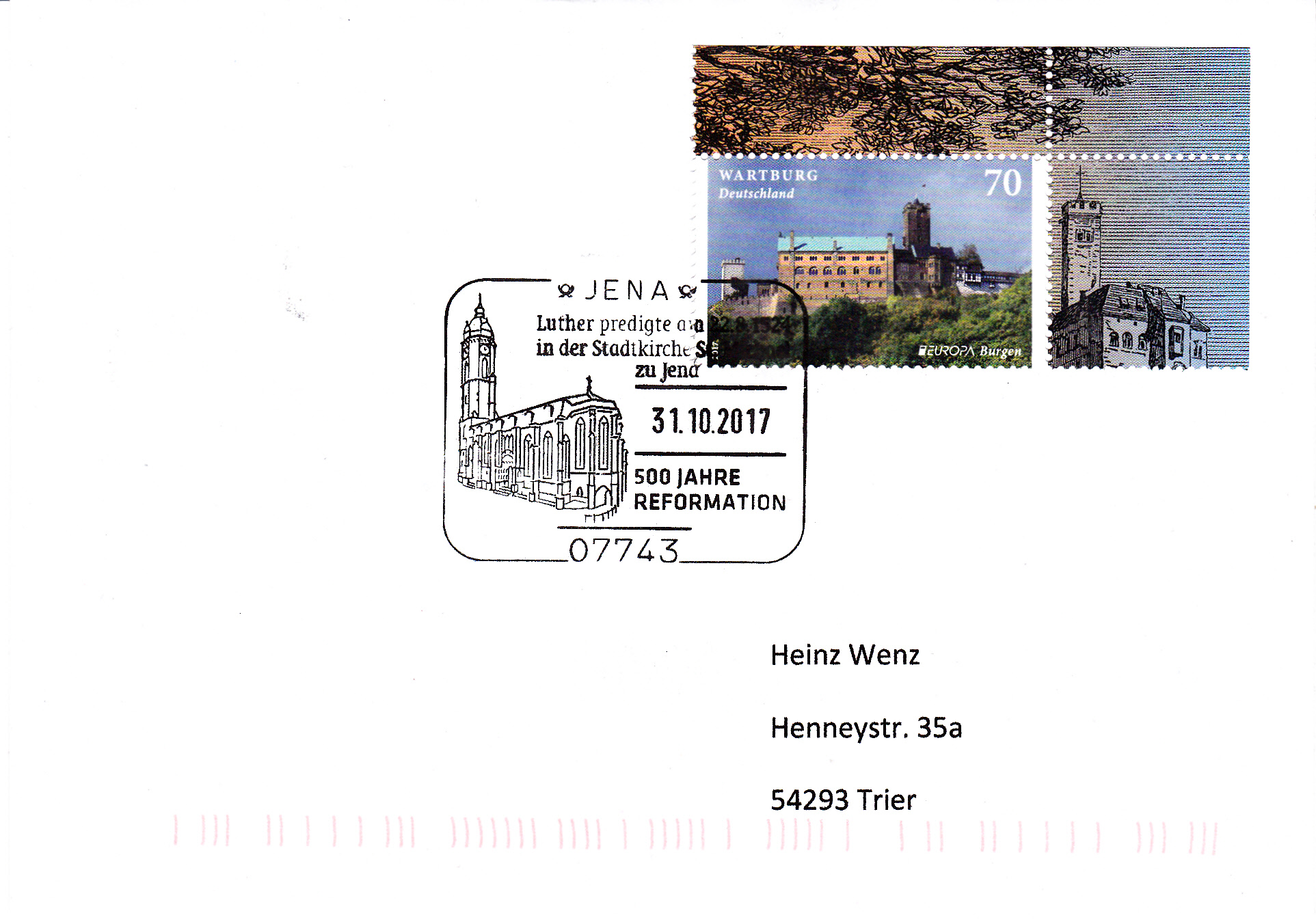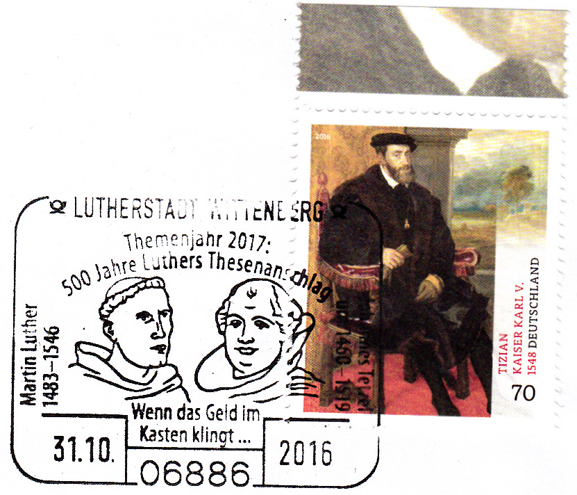 Im Sonderstempel aus Wittenberg vom 31.10.2016 wird links Luther als Augustinermönch und rechts ein Porträt des Ablasspredigers Johannes Tetzel gezeigt.