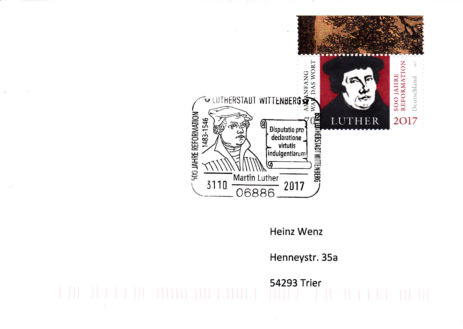 Auch in diesem Sonderstempel vom 31.10.2017 aus Wittenberg ist auf der linken Seite ein Porträt von Martin Luther enthalten.