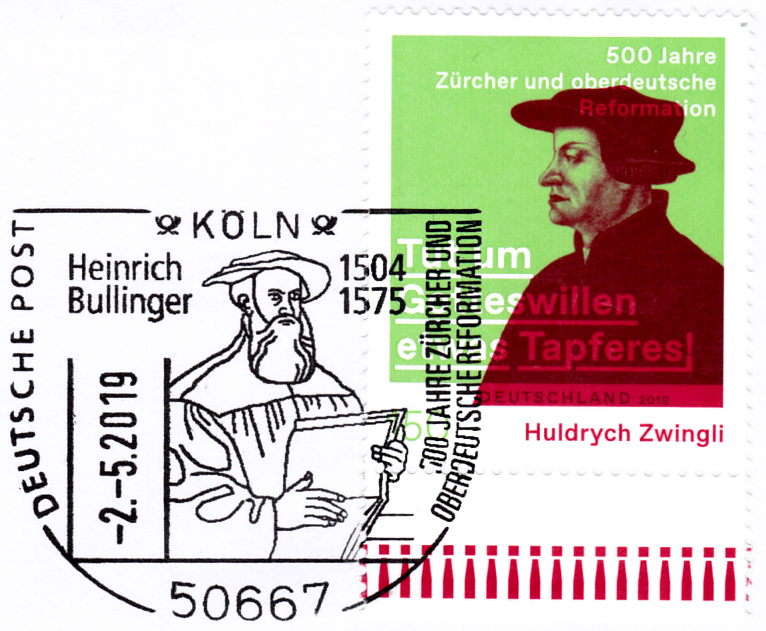 Im Sonderstempel vom 2.5.2019 aus Köln zur Markenausgabe "Huldrych Zwingli – 500 Jahre Zürcher und oberdeutsche Reformation" wird Heinrich Bullinger im Stempelbild gezeigt.