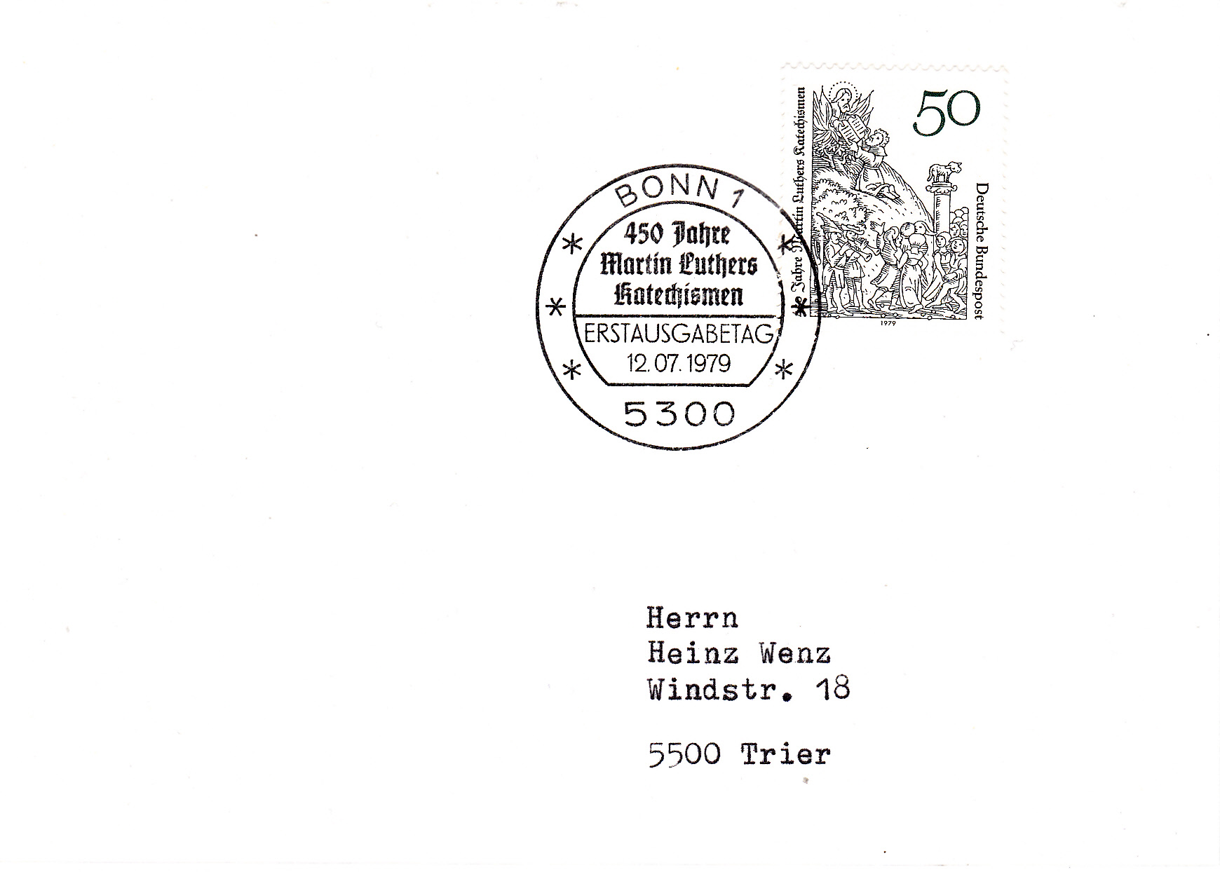 Auf dieser Karte wurde die Marke "450 Jahre Katechismen von Martin Luther" mit dem Ersttagsonderstempel Bonn entwertet.