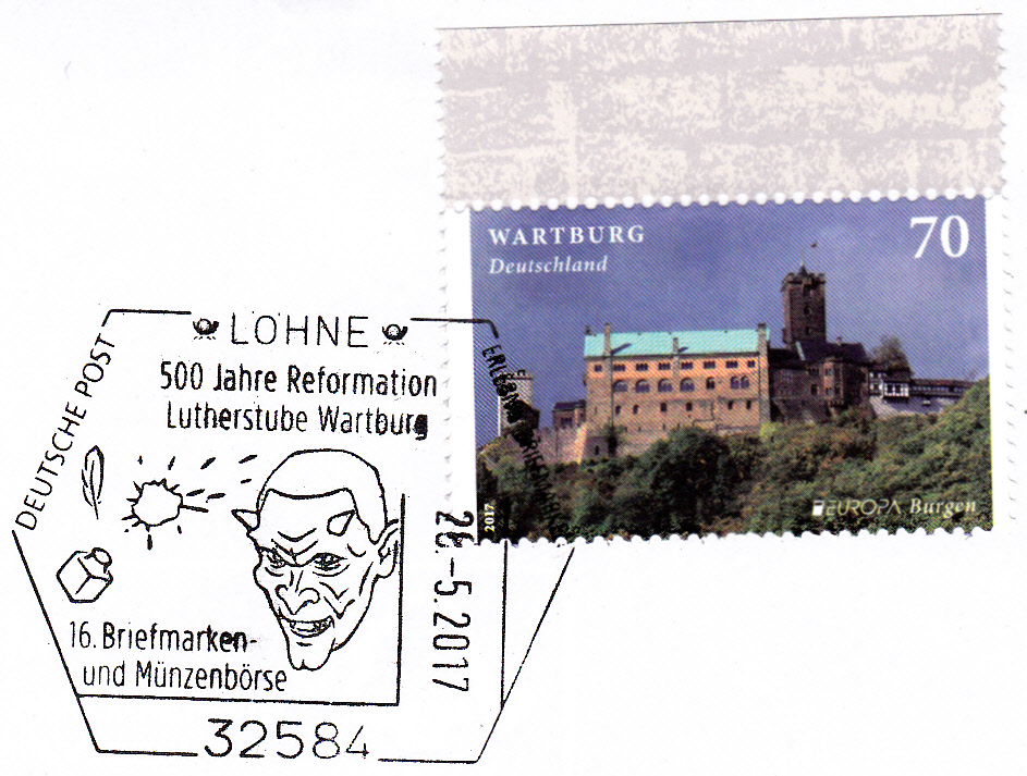 Dieser Sonderstempel vom 26.5.2017 aus Löhne erinnert an diese Legende mit der bildlichen Darstellung des Teufels, des Tintenfasses, des Tintenkleckses und der Inschrift "Lutherstube Wartburg".