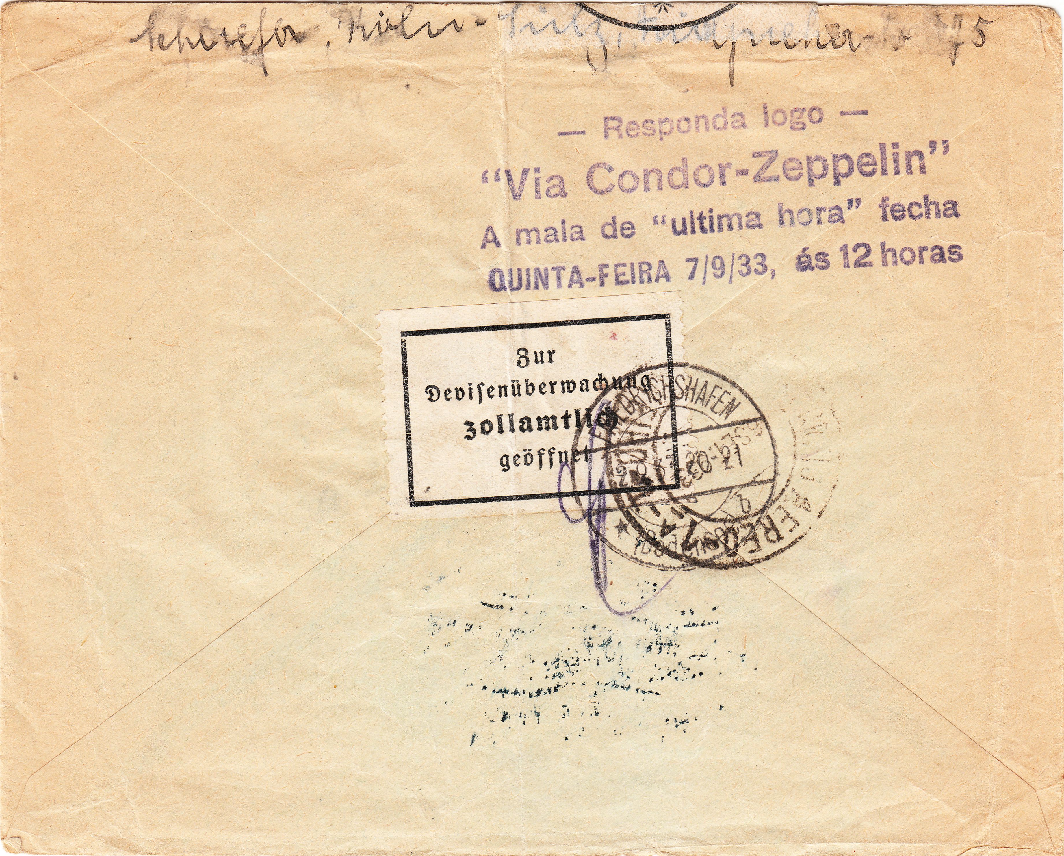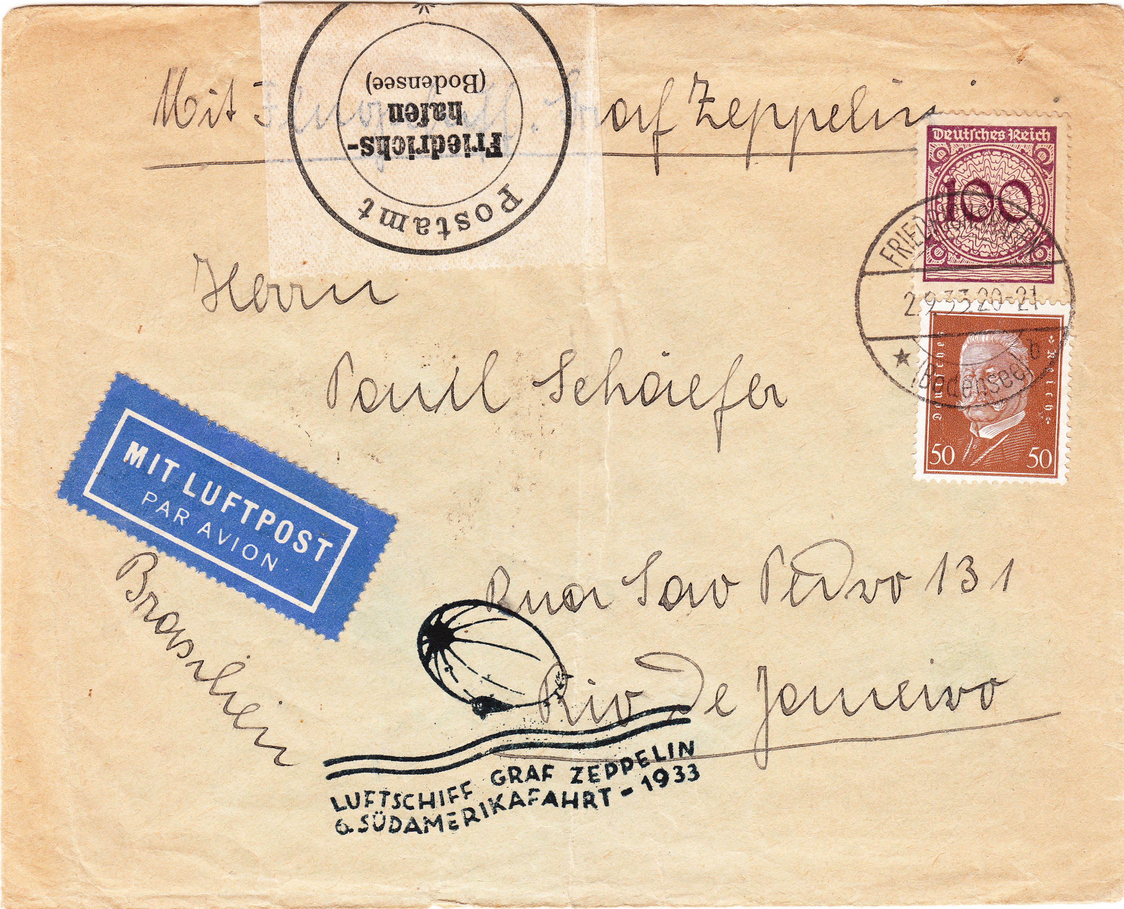 Dieser nach Rio de Janeiro adressierte Brief wurde am 02.09.1933 in Friedrichshafen aufgegeben: