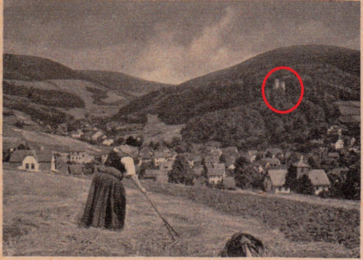 Auf einer Bildpostkarte 1942 (MiNr P 307, Serie 28 Bild 4) sehen wir die Burgruine Hallenburg auf dem Berg über Steinbach-Hallenberg.