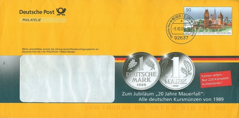 Auch ein weiterer Ganzsachenumschlag der Eigenausgabe der Post (MiNr EA F 456) vom "-5.10.2009" zeigt diesen Wertstempel mit dem Motiv der Marke "1000 Jahre Burg Tangermünde" (MiNr. 2712).