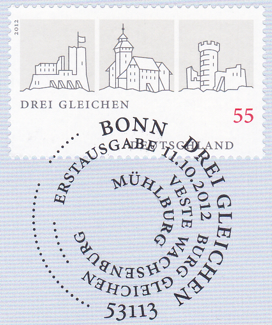 Diese Marke (MiNr 2959) mit dem "Burgenensemble Drei Gleichen" wurde mit dem Ersttagsonderstempel Bonn entwertet.