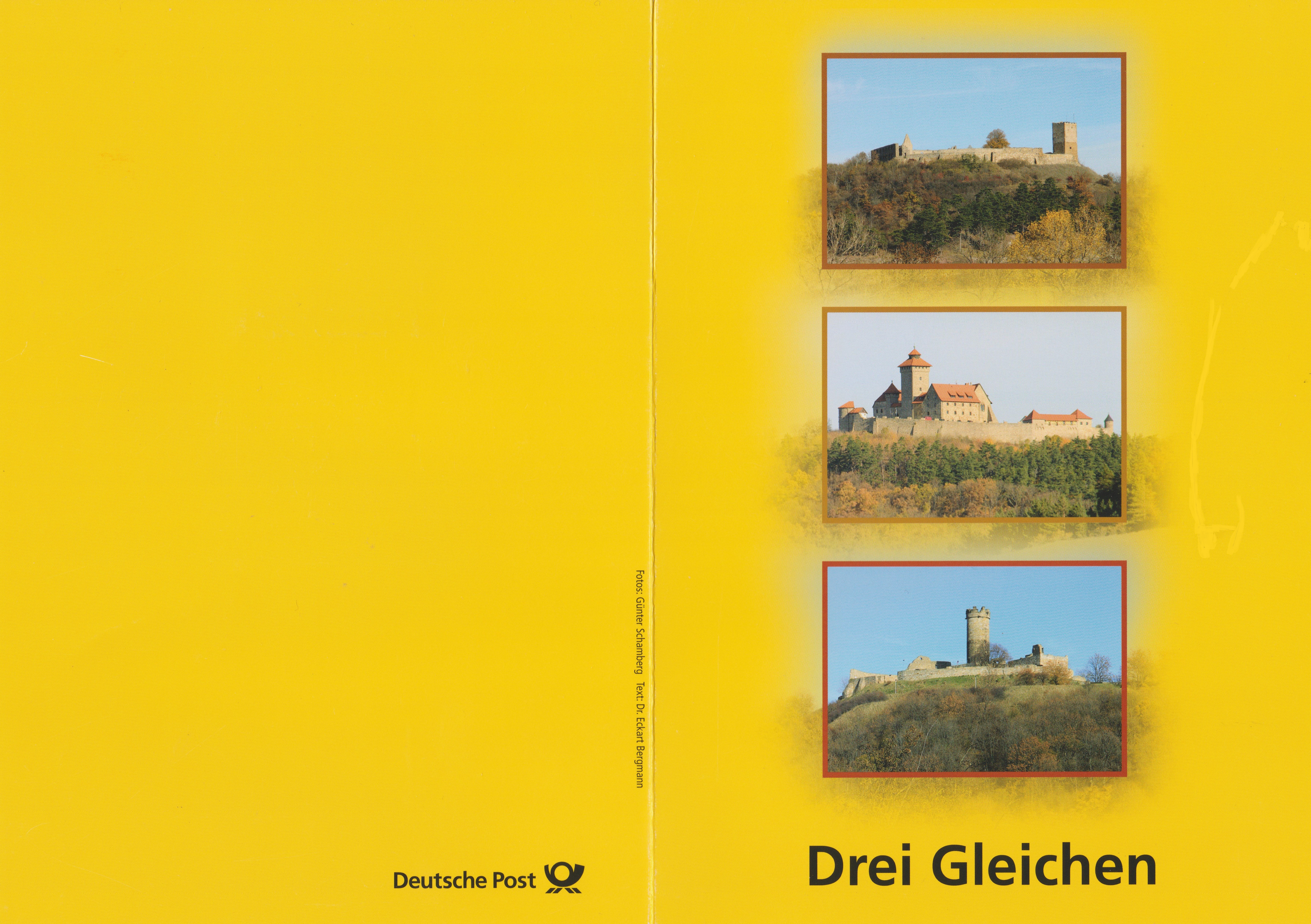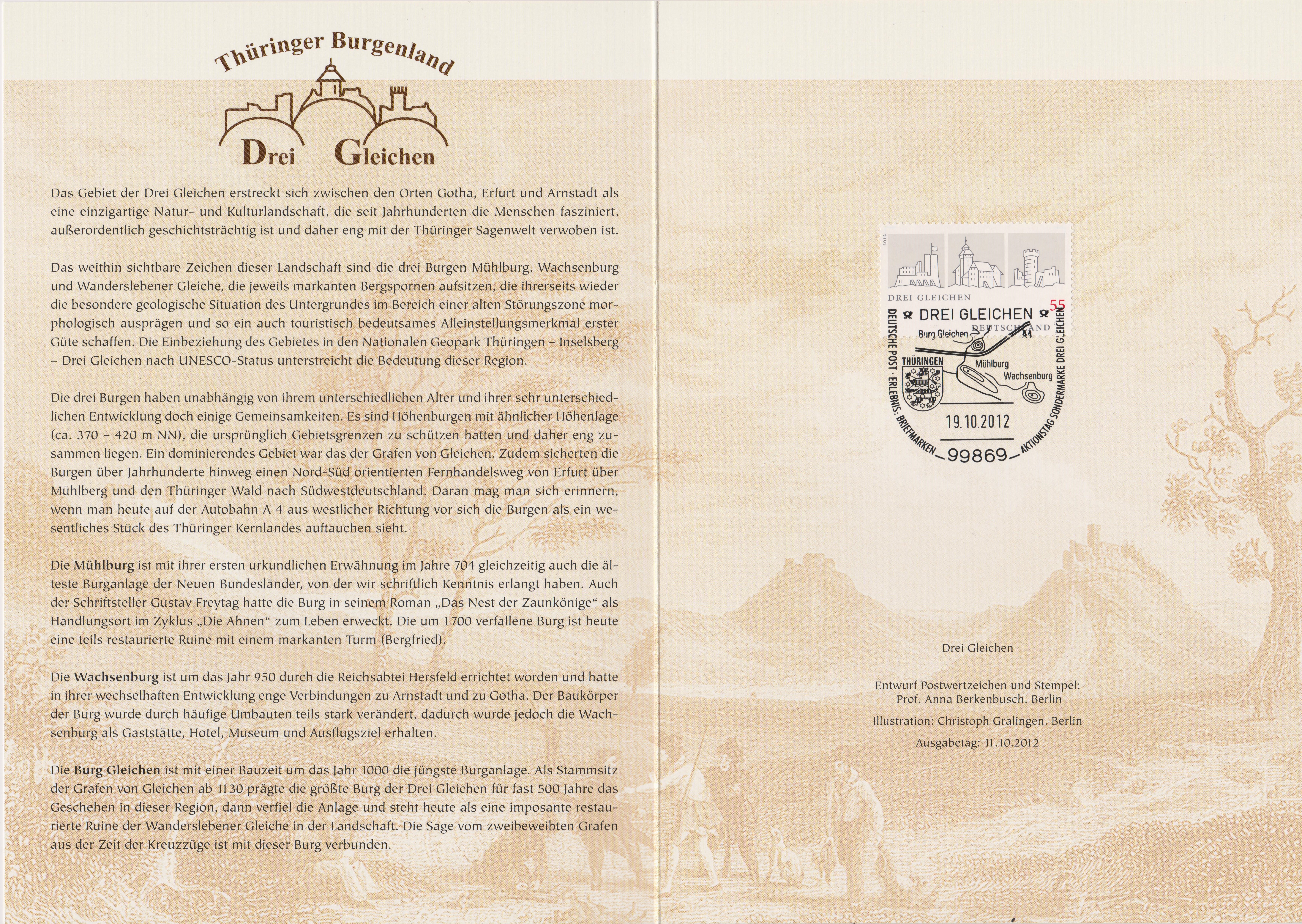 Die Klappkarte des Vorstandsvorsitzenden der Deutschen Post AG mit der Marke "Burgenensemble Drei Gleichen" und dem Ersttagsonderstempel Bonn gibt ein paar Informationen über die Burg Gleichen, die Mühlburg und die Wachsenburg.