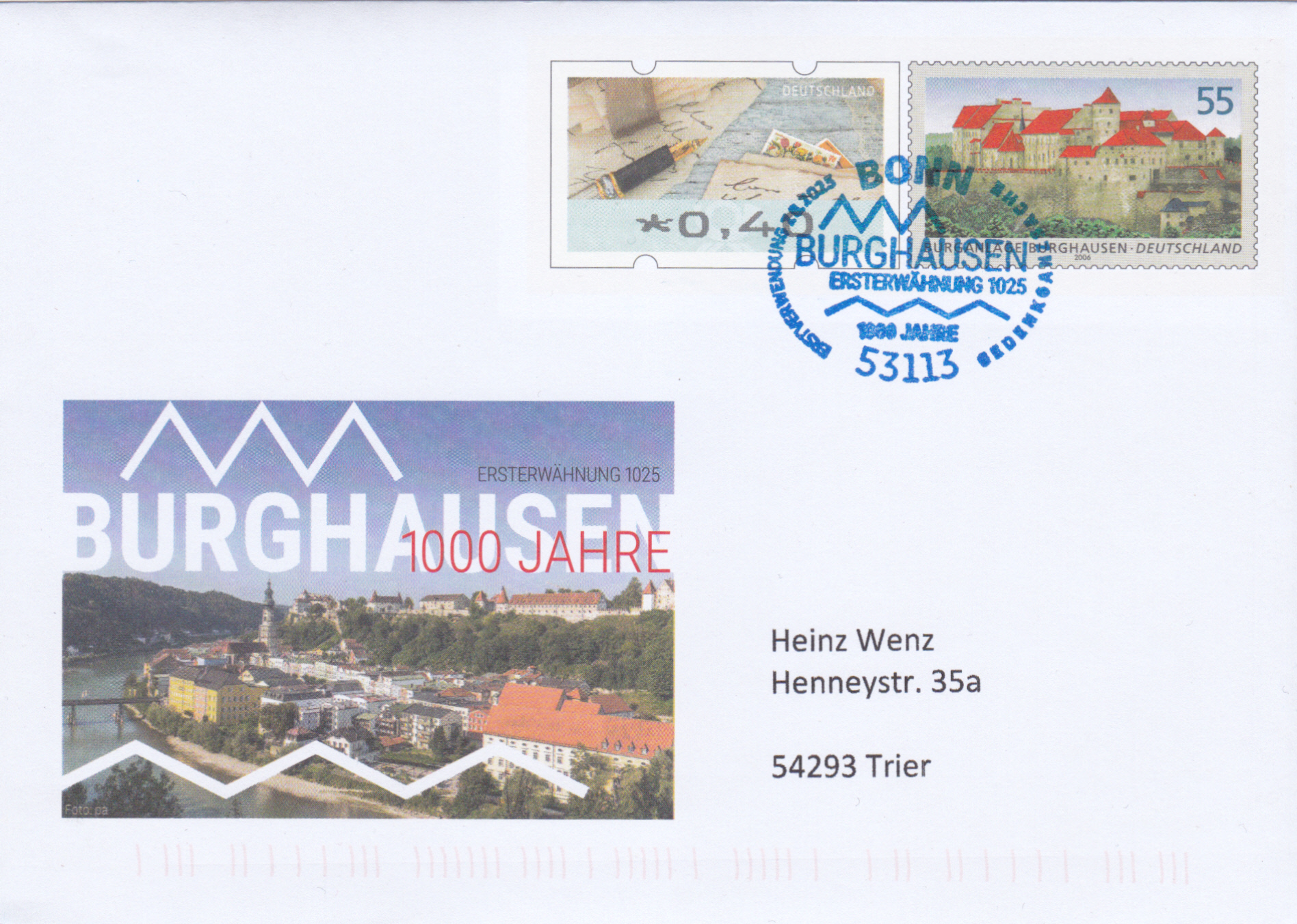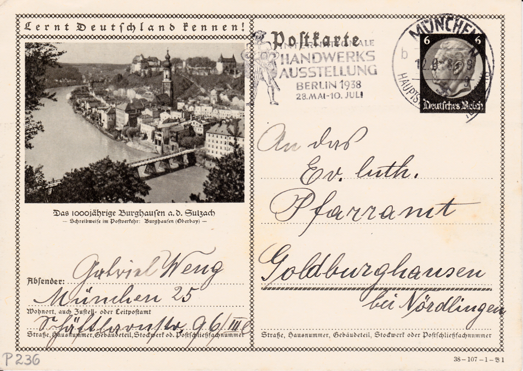 Auf dieser Bildpostkarte 1938 (MiNr P 236 Serie 107 Bild 1) sehen wir die Burg zu Burghausen auf dem Berg oberhalb der Stadt Burghausen.