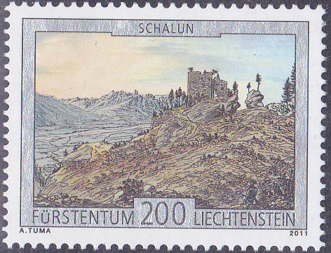 Aus Liechtenstein kommt eine Marke (MiNr 1612) mit der Ruine Schalun.