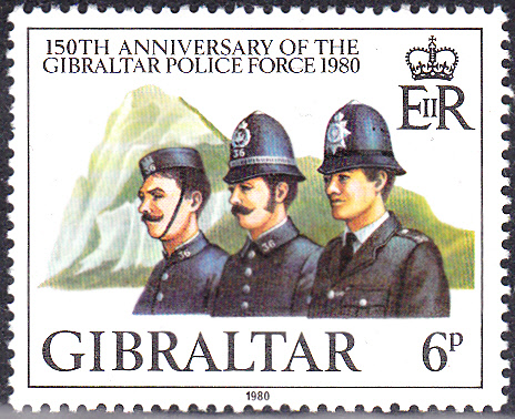 Auf dieser Marke aus Gibraltar (MiNr 402) sind drei Polizisten in Uniformen von 1895 bis 1980 zu sehen, zwei davon tragen einen Custodian helmet.
