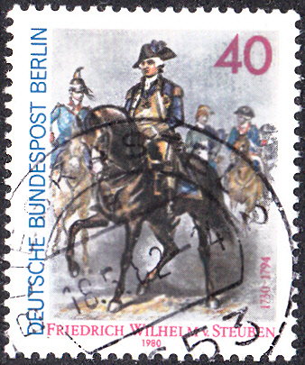Hier eine Marke aus Berlin (MiNr 628) zum 250. Geburtstag von Friedrich Wilhelm von Steuben. Hier trägt von Steuben einen "Napoleonshut"