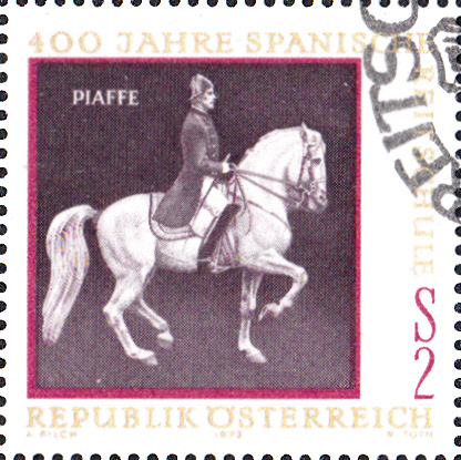 Hier eine Marke aus Österreich (MiNr 1395) mit einem Reiter der Spanischen Reitschule mit einem Zweispitz.