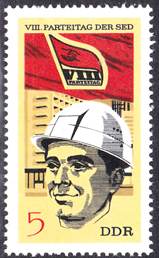 Auf dieser Marke aus der DDR (MiNr 1675) sehen wir einen Bauarbeiter mit Helm.