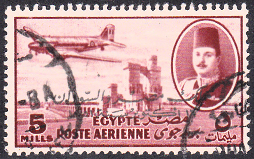 Auch die Marken der Luftpostserie mit dem Nilstaudamm und König Faruk mit Fes erschienen mit Bdr.-Aufdruck dreier Balken über dem Porträt des Königs. Hier eine dieser Marken (MiNr 450, ursprüngliche Marke MiNr 308):