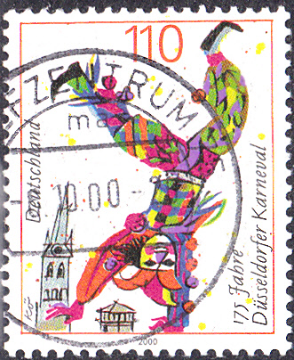 Im Ersttagsonderstempel aus Köln zur Markenausgabe "150 Jahre Kölner Karneval" wird eine typische Narrenkappe im Stempelbild gezeigt.