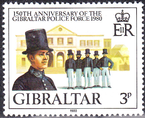 Die Polizeioffiziere aus dem Jahre 1830 auf dieser Marke aus Gibraltar (MiNr 401) zum Jubiläum "150. Jahrestag der Gründung der Polizei auf Gibraltar" tragen Zylinder.