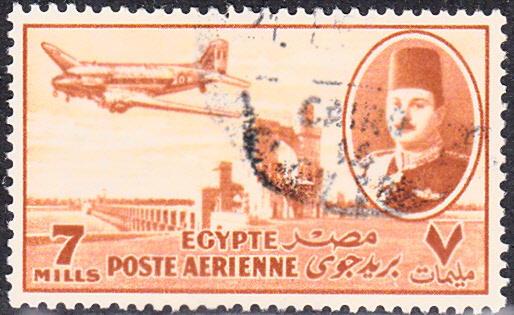 1947 erschien in Ägypten eine Luftpostserie mit mehreren bildgleichen Marken mit dem Nilstaudamm und König Faruk mit Fes. Hier eine dieser Marken (MiNr 308):
